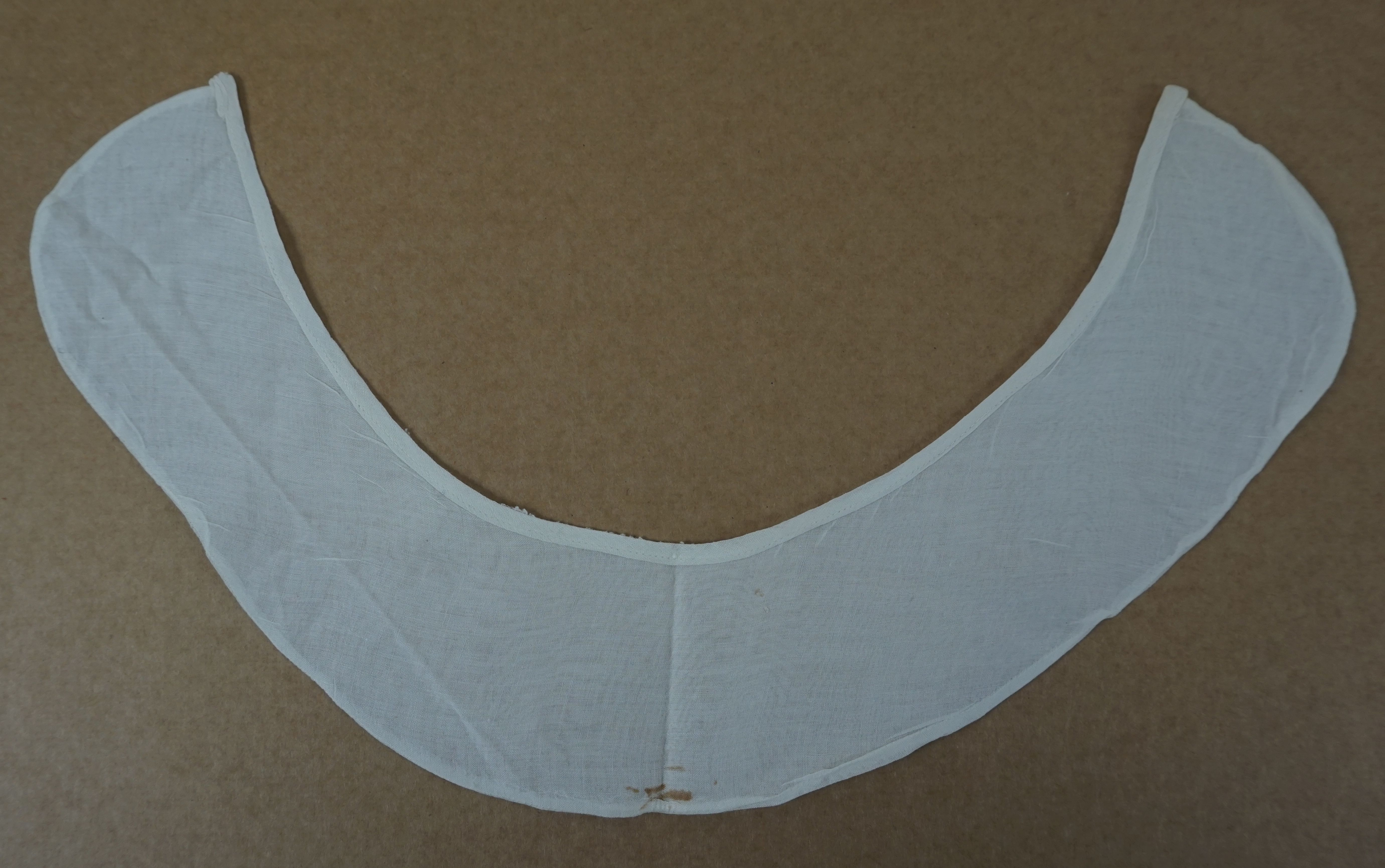 Serveerstel (Dienstmeisje), materiaal: batist, kleur: wit, lengte kraag 55 cm, breedte kraag 7 cm, lengte machetten 22 cm, breedte manchetten 6 cm, één kraag en twee manchetten, machet met drukknopen, huisvlijt, wasmerkje '12', één set zie 'Kaatje ben je boven ?', blz. 68