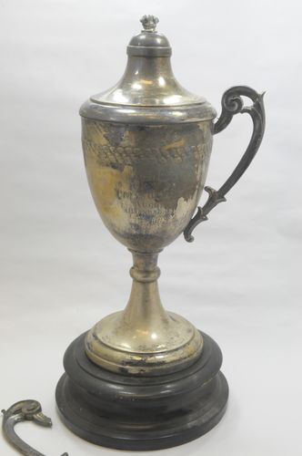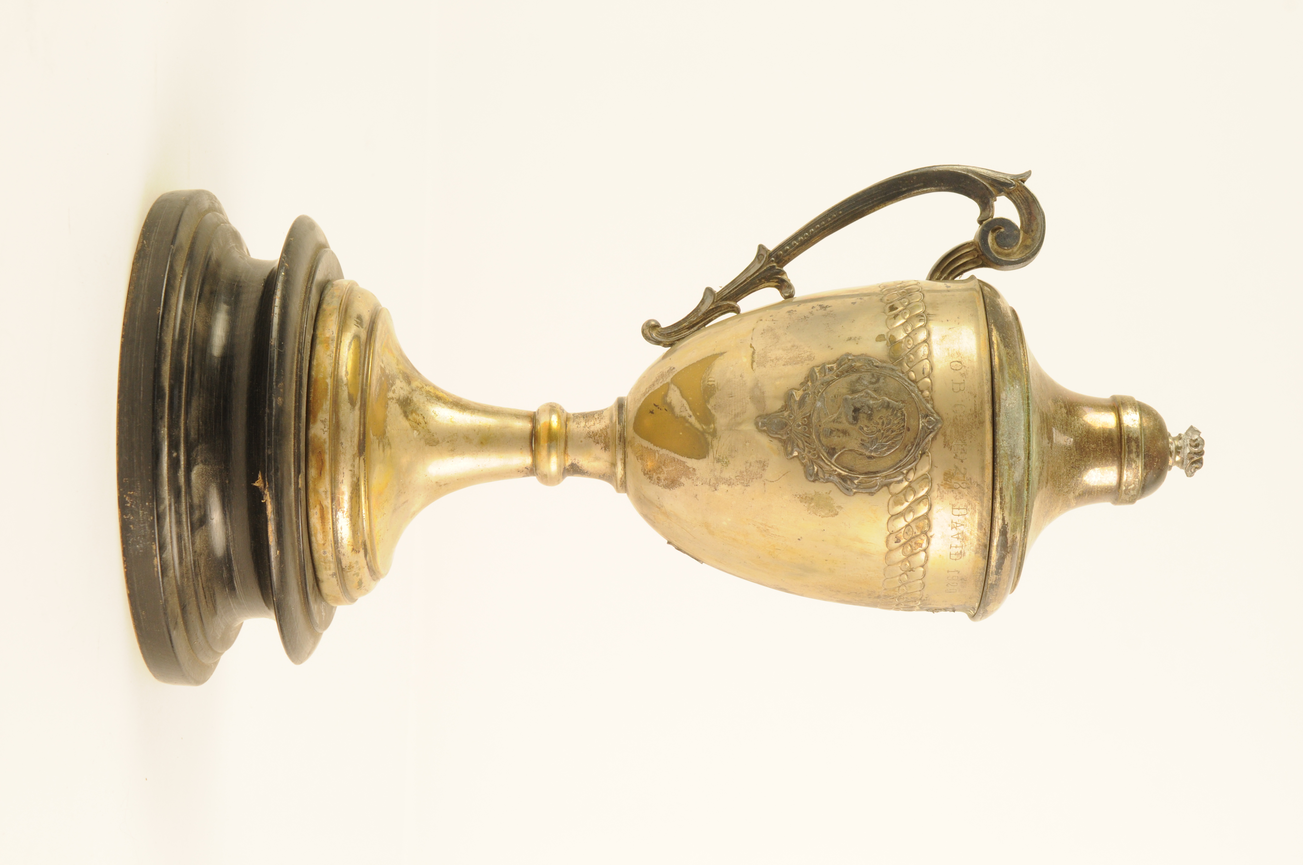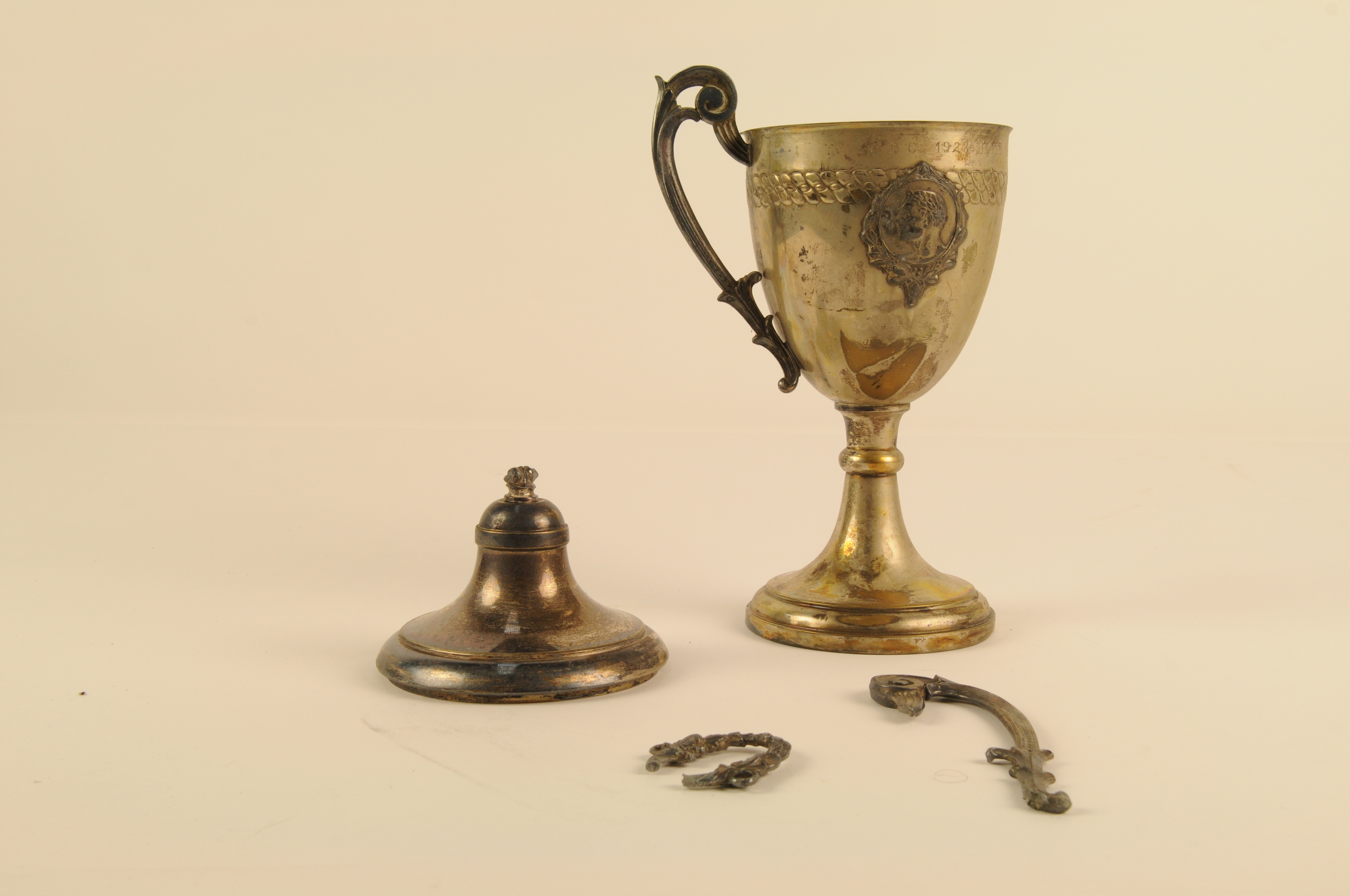 Prijsbeker met deksel en bijbehorende losgeraakte metalen standvoet – 1928, inscriptie: ‘OBC 1928 DAVID 1929’ waaronder een portretmedaillon met een naar links kijkende mannenkop in een rond veld gevat in een krans van lauwertakken, ‘AANGEB DOOR / R.K.V.S. / Prins Hendrik / Vught / Bondsdag / 21/22 7 ‘28, onder de aanzet van de grepen ...