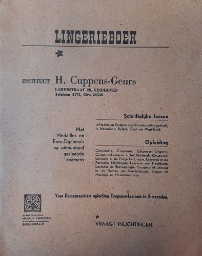 Lesboek "Lingerieboek", geschreven door H. Cuppens-Geurs, Lakerstraat 28 Eindhoven. Tussen het boek zitten enkele uitgeknipte patronen.