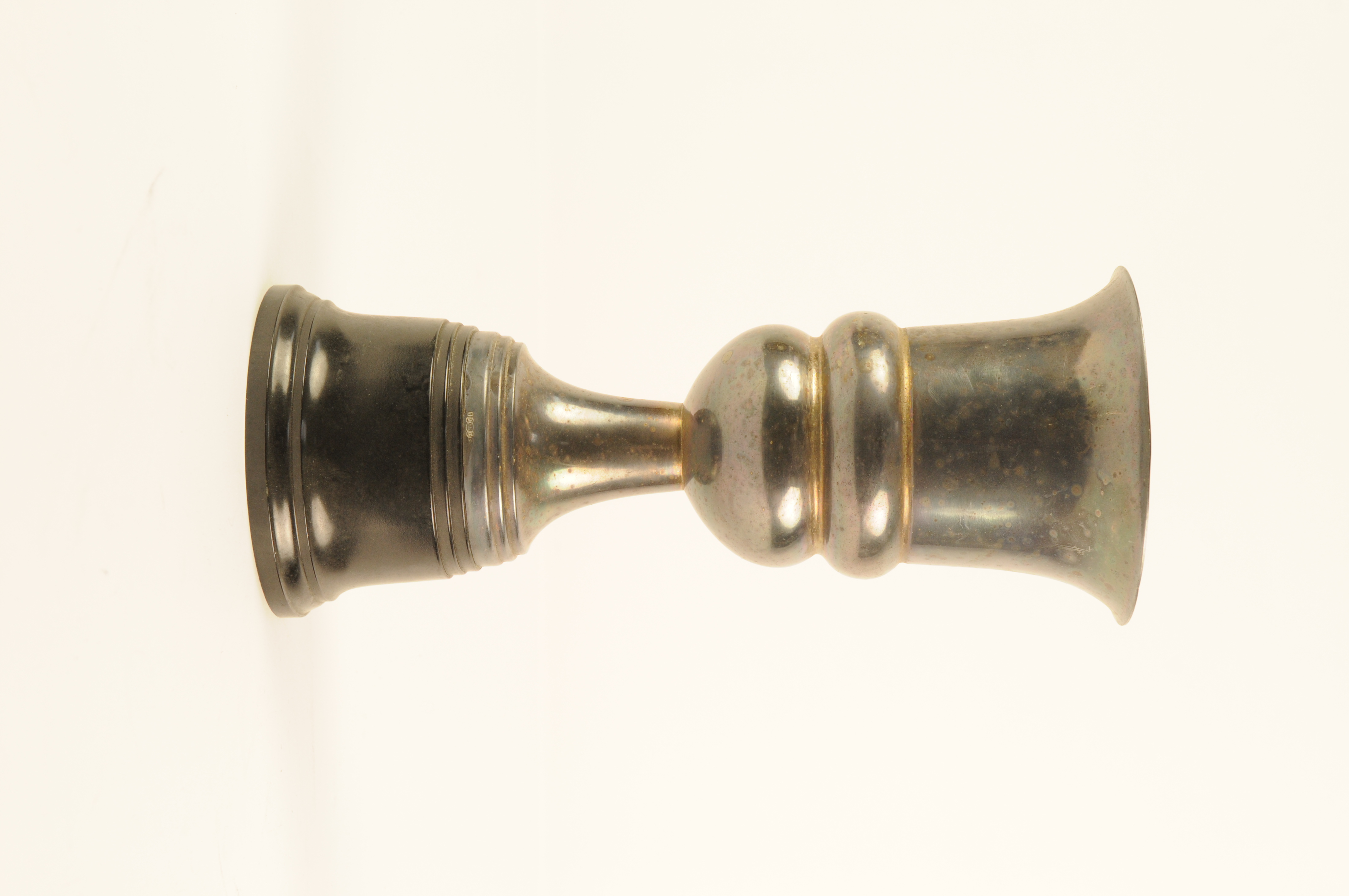 Prijsbeker (zonder deksel) – z.j., materiaal: verchroomd metaal en kunststof (standvoet), afmetingen: 29 x 12,2 cm, zonder tekst als inscriptie