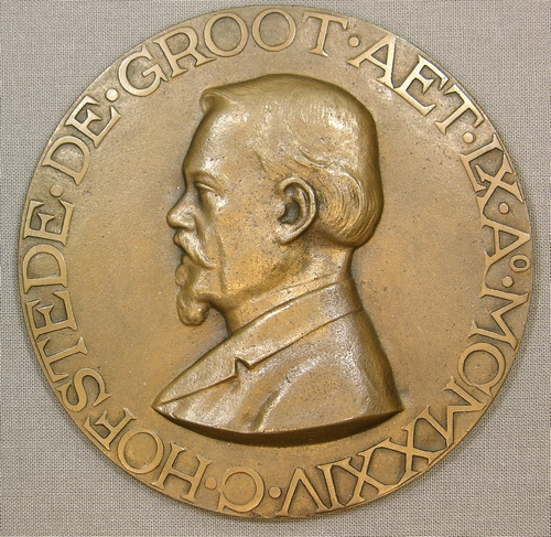 Voorzijde: portret en profil n.l. van C. Hofstede de Groot. Randschrift: 'C. HOFSTEDE DE GROOT AET LX Ao MCMXXIV'. Keerzijde: binnen een krans van eikenbladeren het opschrift: 'DOE NOOIT IETS OOK'. Opschrift Intepretatie: Motto/lijfspreuk van C. Hofstede de Groot ? Opschrift Taal: Latijn Opschrift Positie: voorzijde Opschrift Positie: keerzijde Opschrift Type: randschrift Opschrift Type: reliëfopschrift Opschrift Type: monogram Opschrift Inhoud: "C. HOFSTEDE DE ...