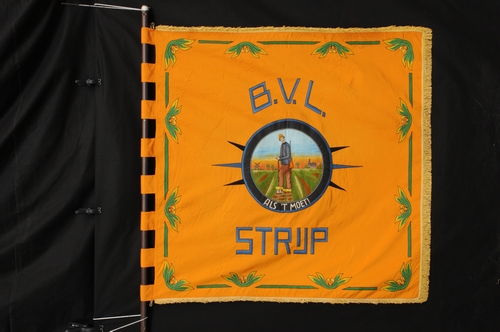 Vaandel Bijzondere Vrijwillige Landstorm Strijp - 1e helft van de 20e eeuw, materiaal: kunstzijde, kleur: eigeel, afmetingen: lengte 135 cm, breedte 138 cm, machinaal geborduurd, rondom op drie zijden afgezet met 5 cm brede franje, in blauw geborduurd 'Strijp', in blauw geborduurd 'B.V.L.', medaillon waarop een boer op het land met op de achtergrond een ...
