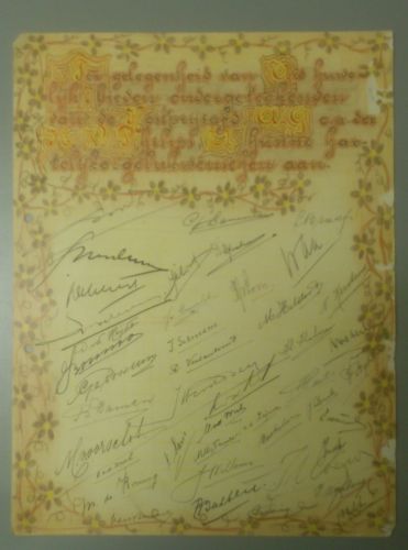 Aantal handtekeningen verzameld op stevig papier. Tekst gelukswensen in zwart, rood en geel schoonschrift: 'Ter gelegenheid van uw huwelijk bieden ondergeteekenden van de Kostprijsafd A.G. e.a. der K.V. Philips u hunne hartelijke gelukwenschen aan.' Aan de randen bloemen in bruin en geel. Op achterzijde in rechterhoek: hart in rood getekend Moeder (Adrienne Virginie Josiassen) is met ...