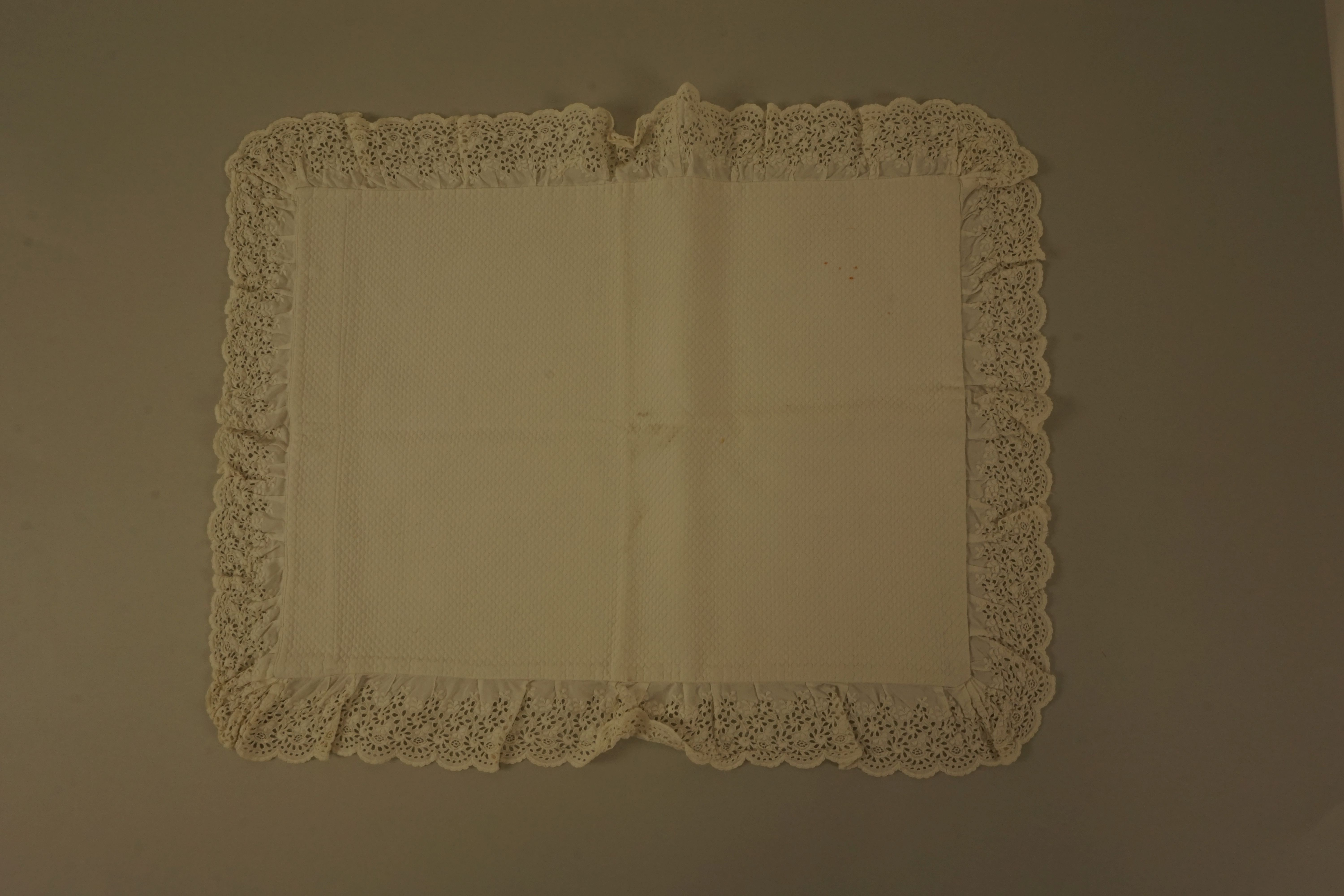 Kussensloop (kinder-), materiaal: katoen (piqué), kleur: wit, lengte 56 cm., breedte 45 cm., rondom 6 cm breed broderiekant tussen de naden genaaid, sluiting drie knopen , drie handgemaakte knoopsgaten, geborduurd wasmerk bijna verdwenen, hoort bij 2007.02.176 en 2007.02.178