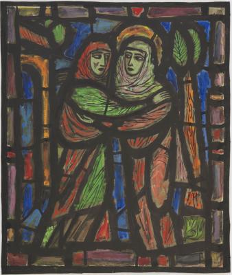 Tekening van fragment Mariaraam St. Catharinakerk te Eindhoven (in absis), Visitatie: Maria en Elisabeth, gouache,aquarel, en kleurkrijt /papier, 760 x 640 mm