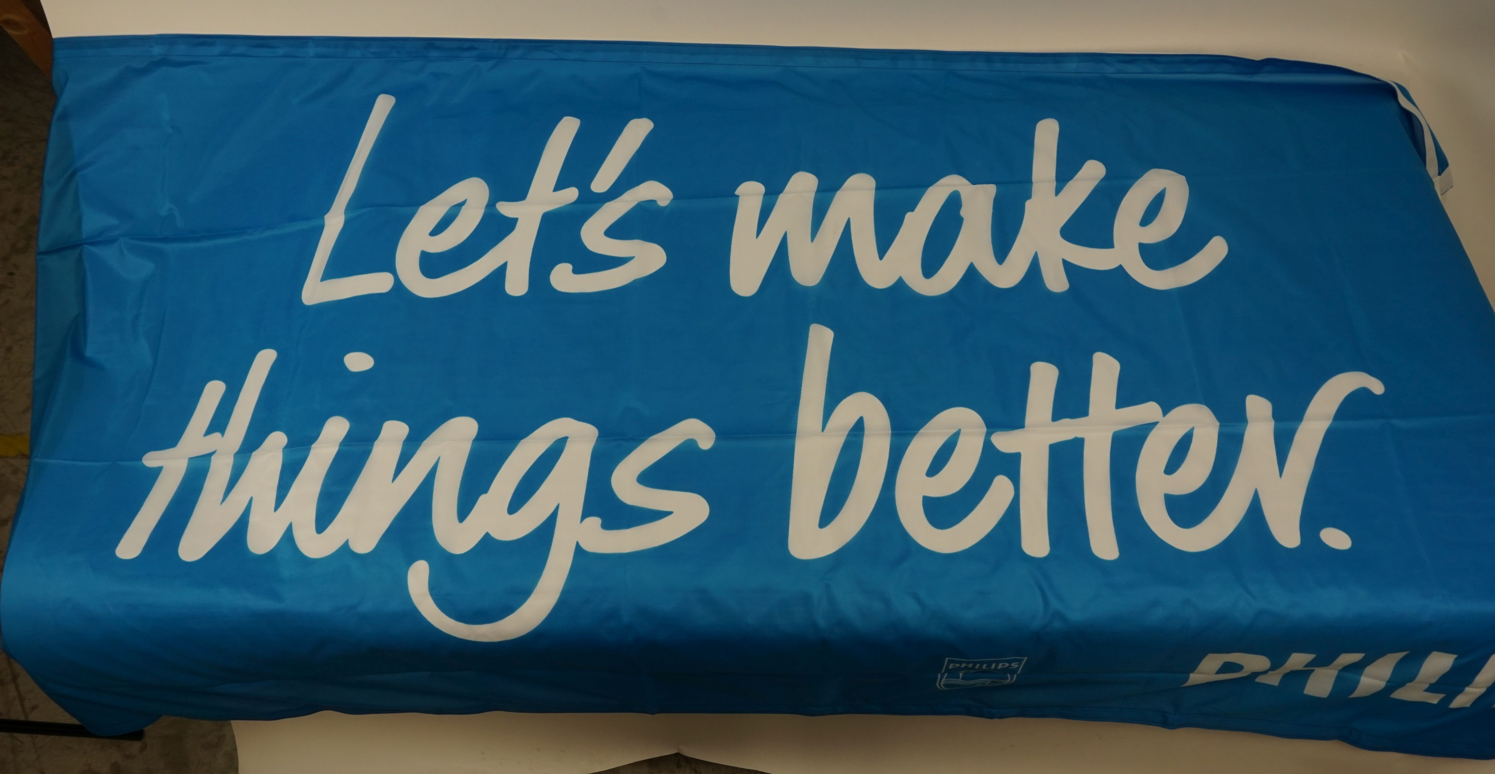 Philips-vlag 'Let's make things better' - 1995/1996, materiaal: synthetisch, kleur: bleu/wit, spandoek lengte 120 cm, breedte 250 cm, ingepakt in een synthetische zak met gaatjes, met synthetisch koord, etiket geplakt: Philips spandoek 120 x 250, opdruk : 'Let's make things better'