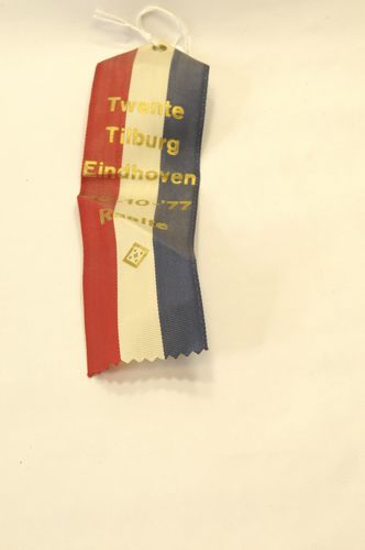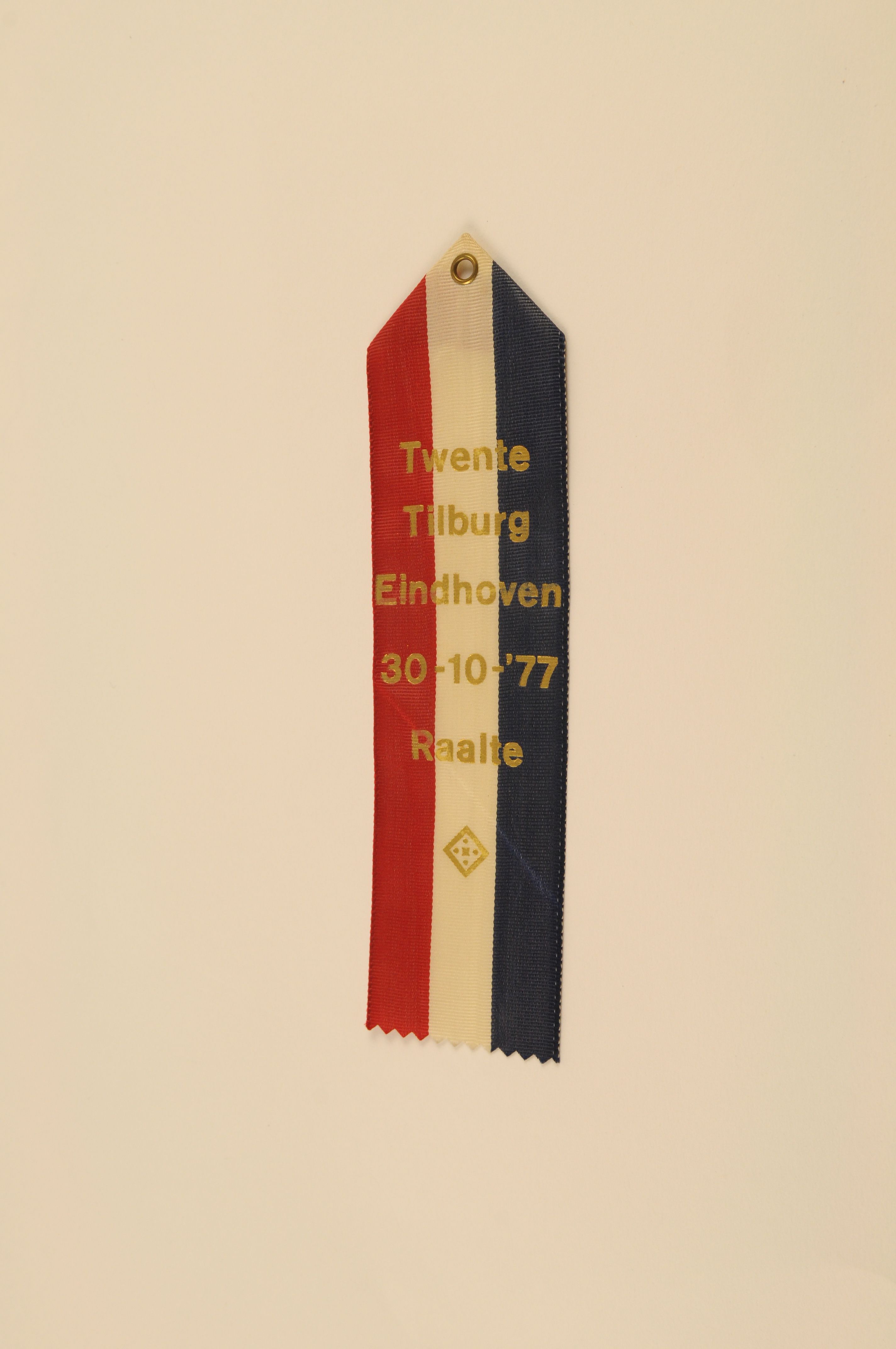 Vaantje Twente Tilburg Eindhoven – 1977, materiaal: kunstvezel/nylon, kleur: rood/wit/blauw en goudkleurig, afmetingen: 18 x 5 cm, rood/wit/blauw verticaal gebaand vaantje, bovenaan puntvormig en onderaan gekarteld, met in vergulde letters de opdruk: ‘Twente / Tilburg / Eindhoven 30 -10-’77 Raalte’ + vignet/embleem