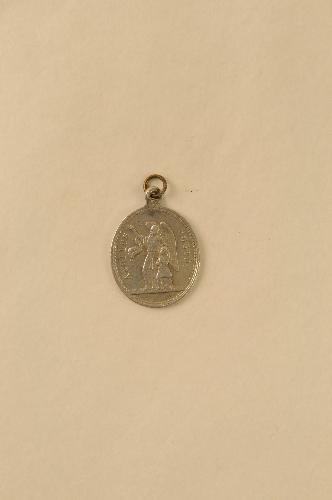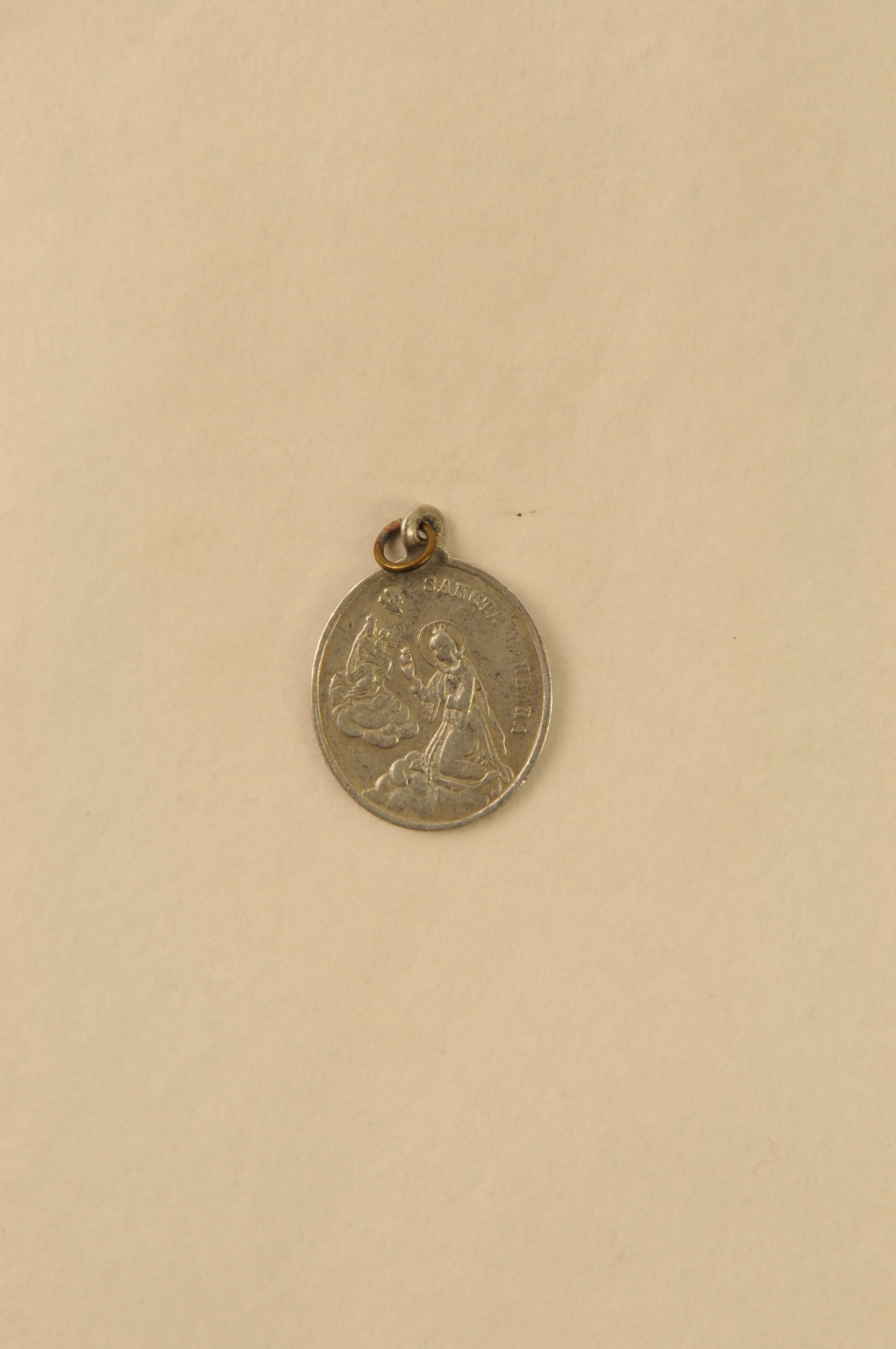Religieuze medaille/draagpenning, materiaal: aluminium, een ovale penning met op vz.een reliëfafbeelding van de H. Barbara in aanbidding van de maagd Maria en de H. Geest en het randschrift ‘SANCTA BARBARA’ en op de kz. een reliëfafbeelding van een engelbewaarder met een kindje en het randschrift ‘ANGELUS CUSTOS’, 2,8 x 2,1 x 0,1 cm