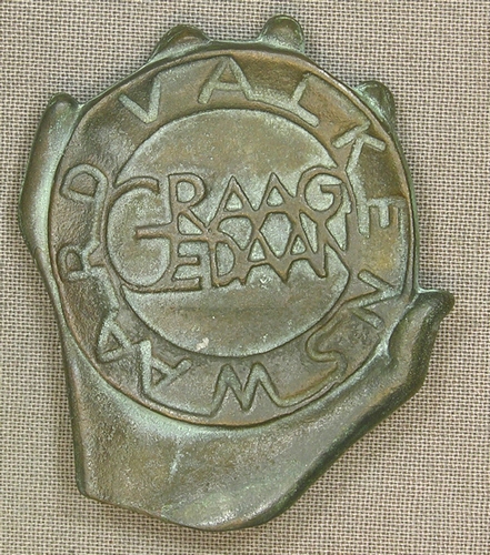 Penning 'Graag gedaan Valkenswaard' - z.j., brons, diam. 52 mm, dikte 9 mm, vz.: ´GRAAG GEDAAN´, randschrift: ´VALKENSWAARD´, kz. gemodelleerd in de vorm van een hand gemonogrammeerd zijkant: JR (ineen)