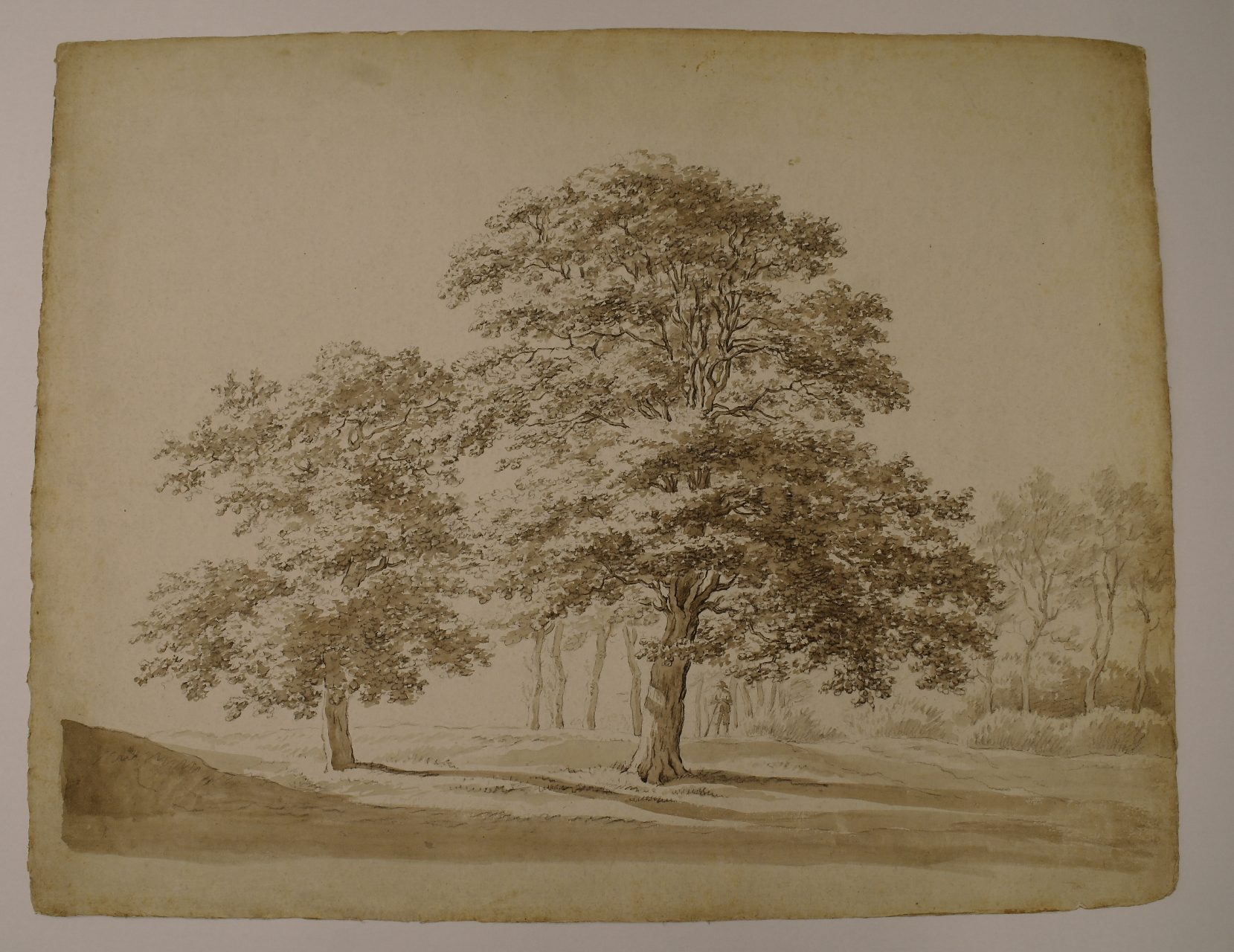 Jager onder een boomgroep. Op de voorgrond twee forse bomen.