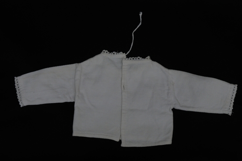 Babyhemdje, materiaal: katoen piqué, kleur: wit, lengte 19,5 cm, breedte 22 cm, tunneltje gmaakt in hals, bandje doorgehaald, hals en pols afgezet met broderierandje, middenachter hele split met 1 handgemaakt knoopsgat en porseleinen knoopje, stof is van binnen geruwd, huisvlijt