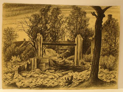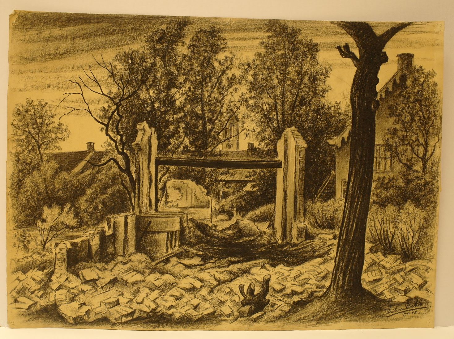 Achter de huizen - 1948, zwart krijt/papier, 455 x 630 mm, gesigneerd en gedateerd r.o.: AntoonBeks 19/6 '48