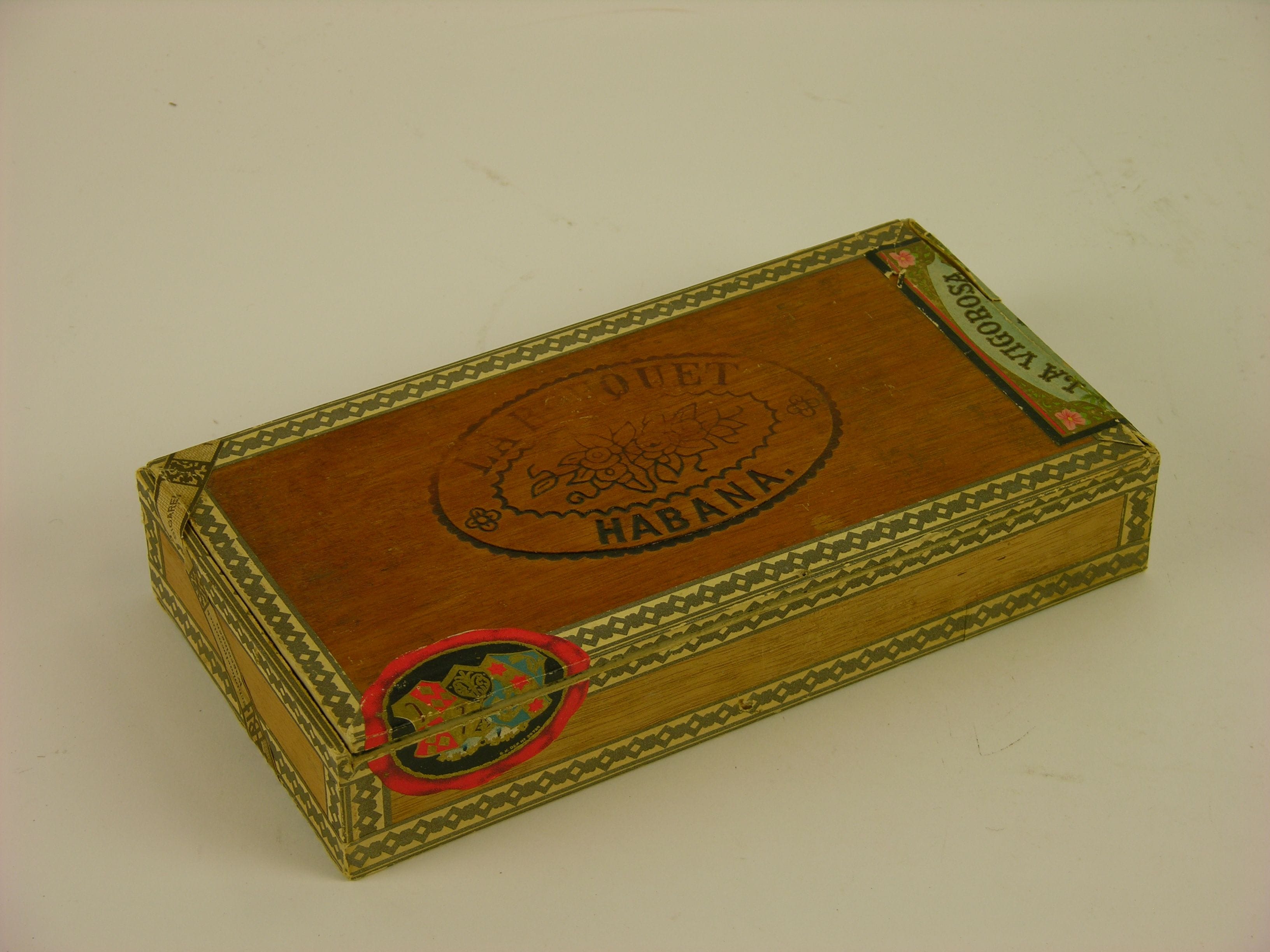 Sigarenkistje 'Schimmelpenninck La Bouquet Habana' - jaren 1930, materiaal: hout, ijzer (sluitwerk) en chromolithografie/papier, afmetingen: 4,3 x 24,8 x 13 cm, sigarenkistje 'Schimmelpenninck La Bouquet Habana' met chromolithografisch etiket waarin 26 sigaren met bandje 'Fina Flor Superior' (Schimmelpenninck), tekst in ovaal verdiept reliëf deksel aan buitenzijde: 'La Bouquet Habana', binnenzijde deksel: chromolithografie op zwart papier, ...