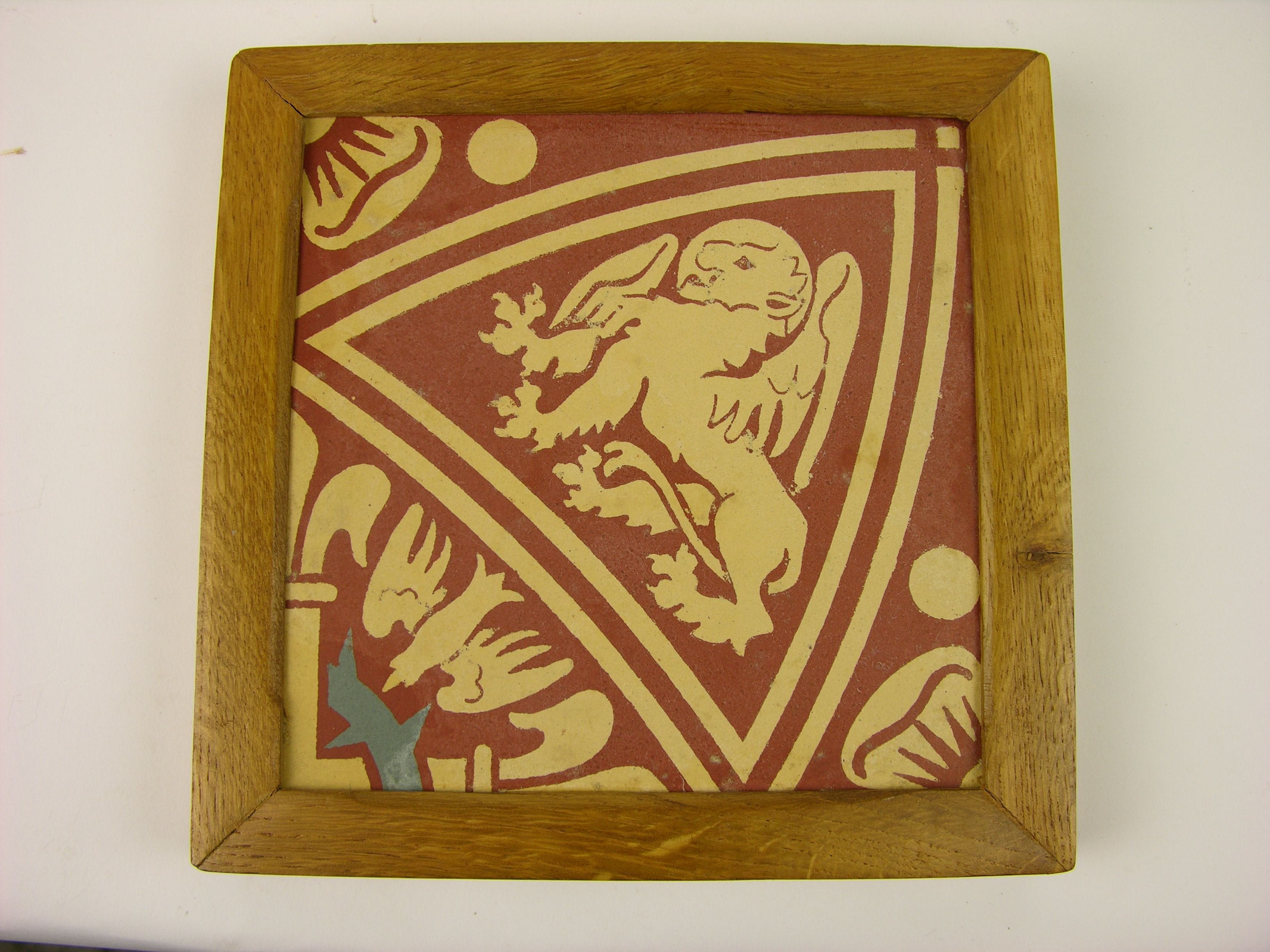 Wandtegel met evangelistensymbolen en bloemmotieven - omstreeks 1900, aardewerk/geglazuurd, 16,8 x 16,8 x 1,5 cm, op sommige exemplaren op de achterzijde reliëfopschrift 'Villeroy & Boch Mettlach' (gevolgd door een nummer in romeinse cijfers). Bij enkele exemplaren is de firmatekst onleesbaar door metselpecie