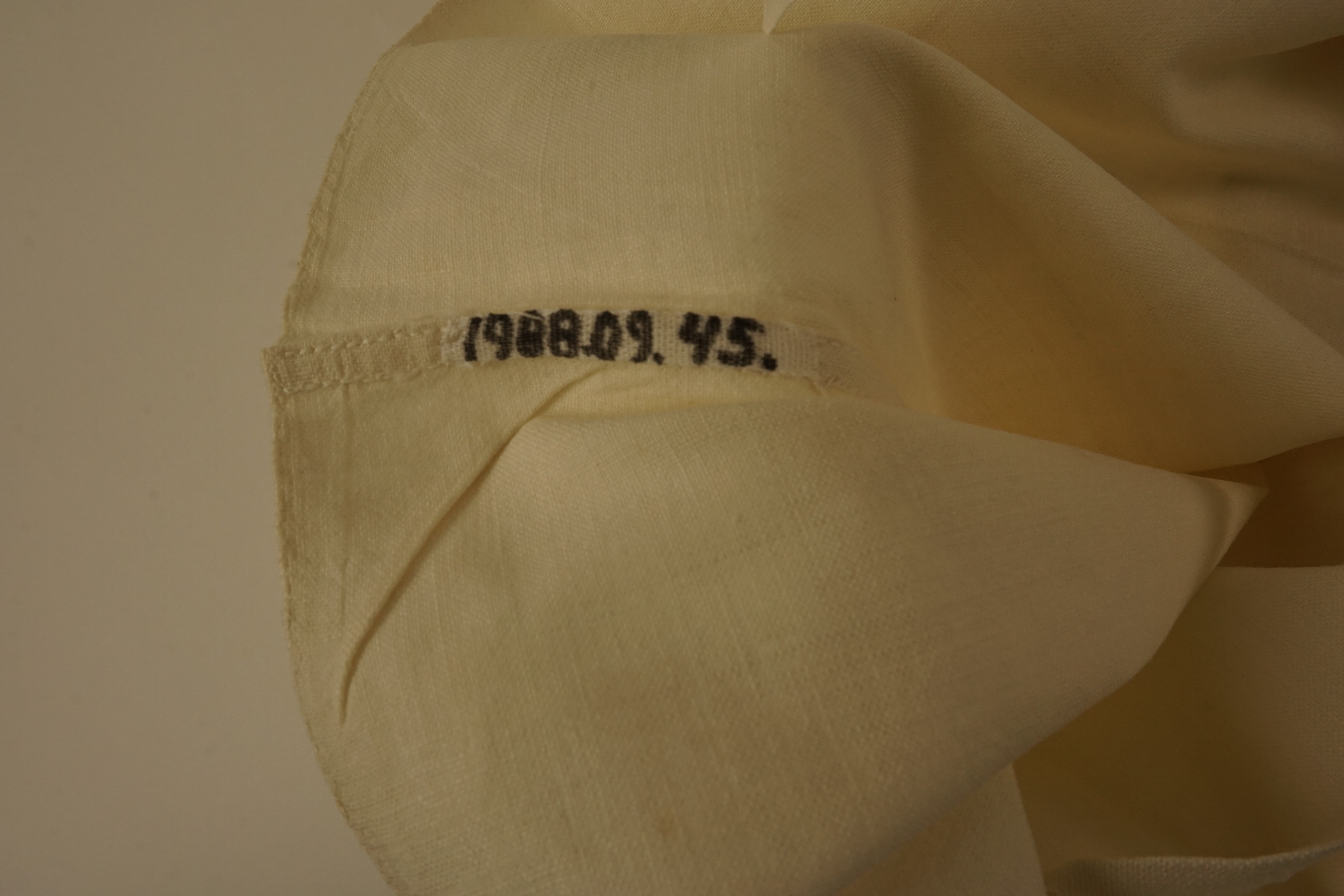 Sloop, materiaal: linnen, kleur: wit, lengte 75 cm, breedte 50 cm, onderkant met de hand genaaid ,zijkant naad machinaal, 4 linnen bandjes aan de binnenzijde