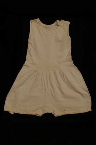 Gympakje, materiaal: katoen, kleur: wit, met schoudersluiting van twee knoopjes ronde hals broek aan lijfje gerimpeld ingezet kruisje, aan de pijpjes ingeregen elastiek rechter kant van broek ingezette zak, verlaagde taille