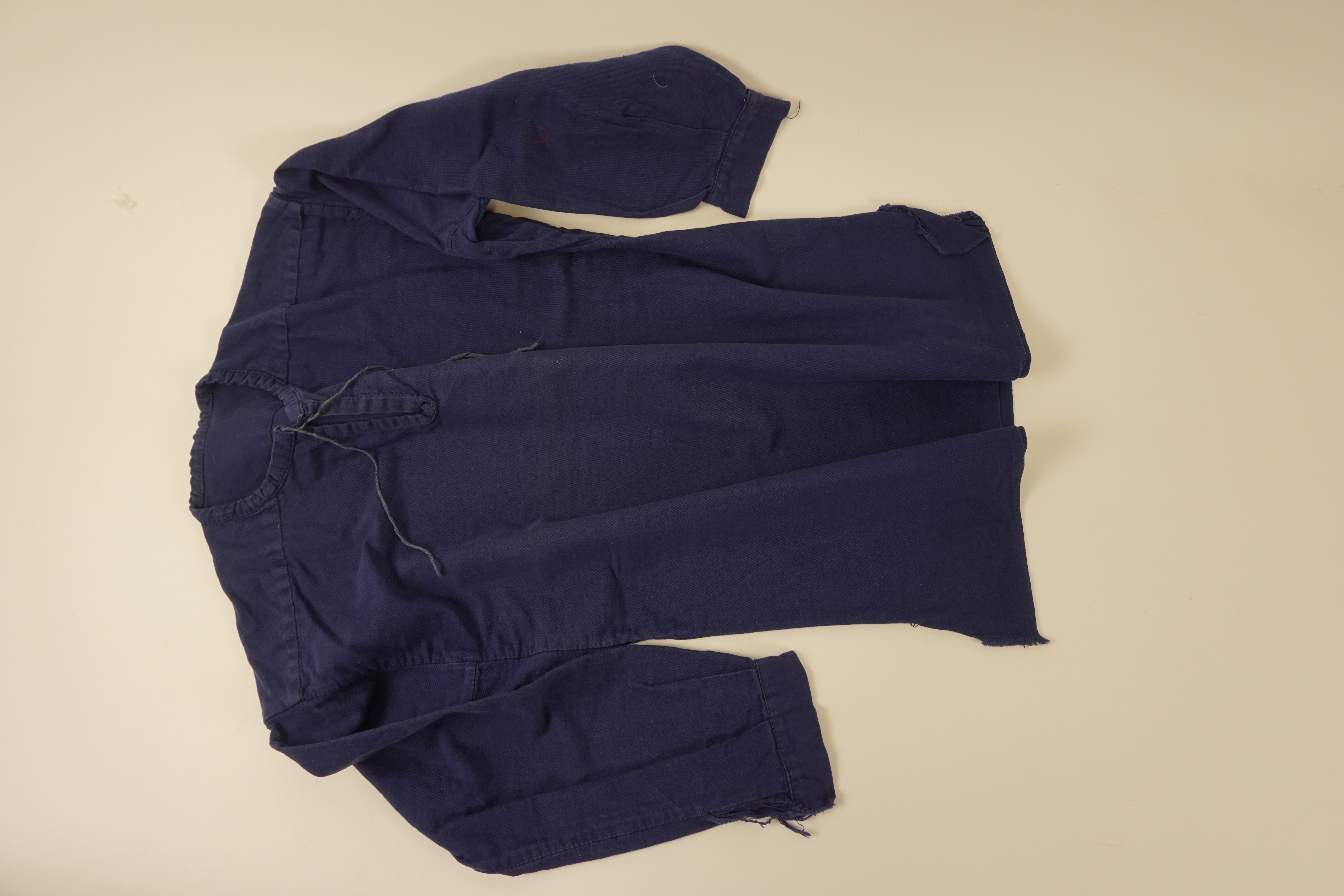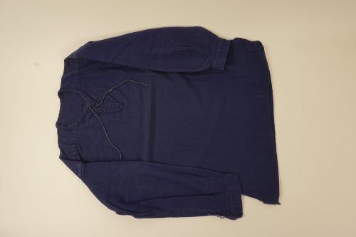 kleur; blauw ronde hals met split, veter door de ronde hals, oksel vierkant ingezet, aangezette manchetten, schouderstuk kleur: blauw ronde hals met split, veter door de ronde hals, mouwlengte: 51 cm, een okselvierkant ingezet, manchetten 4 cm breed, schouderstuk (maat 50)
