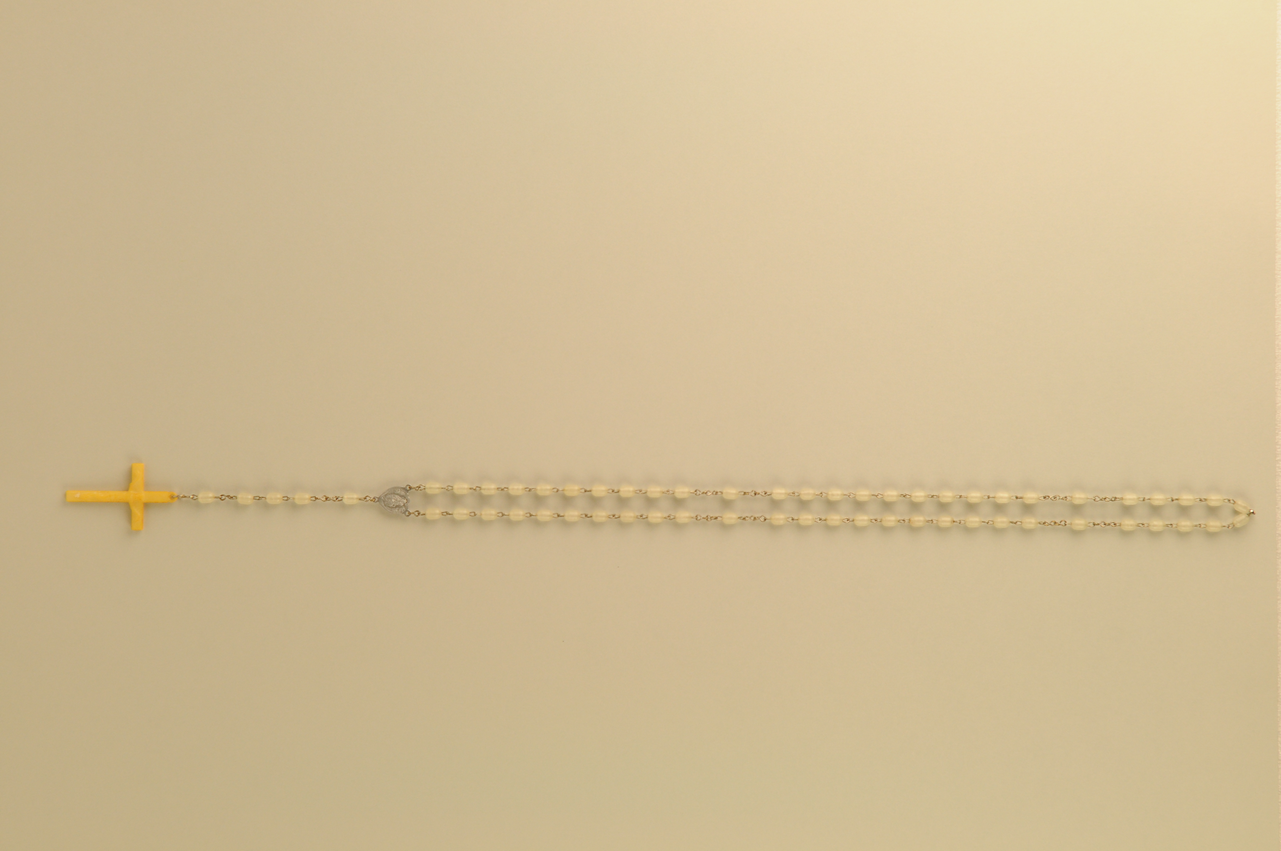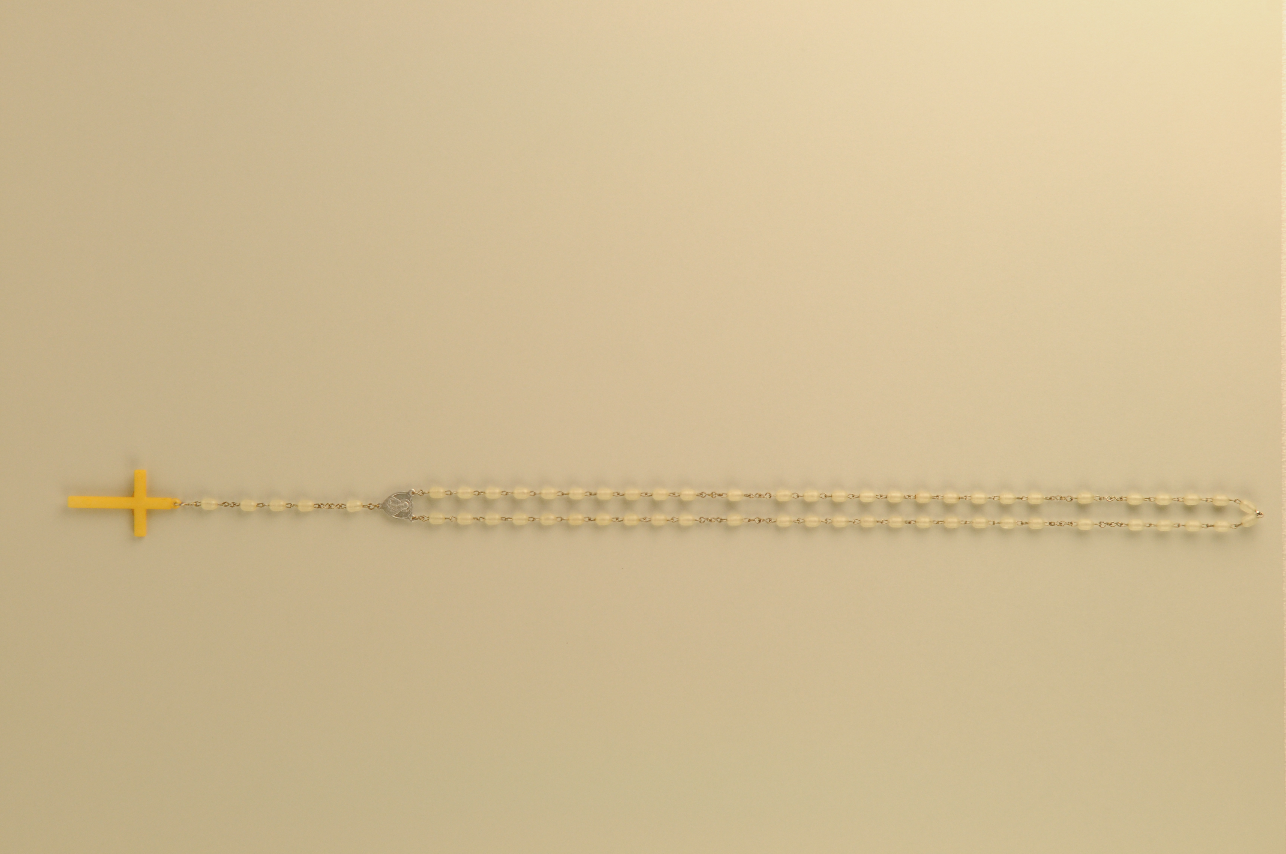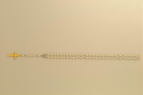 Rozenkrans (paternoster), materiaal: plastic en messing/verchroomd, rozenkrans bestaande uit witte plastic kralen verbonden door verchroomde messing ketting, met witte plastic crucifix, lengte 52,5 cm, breedte 3 cm