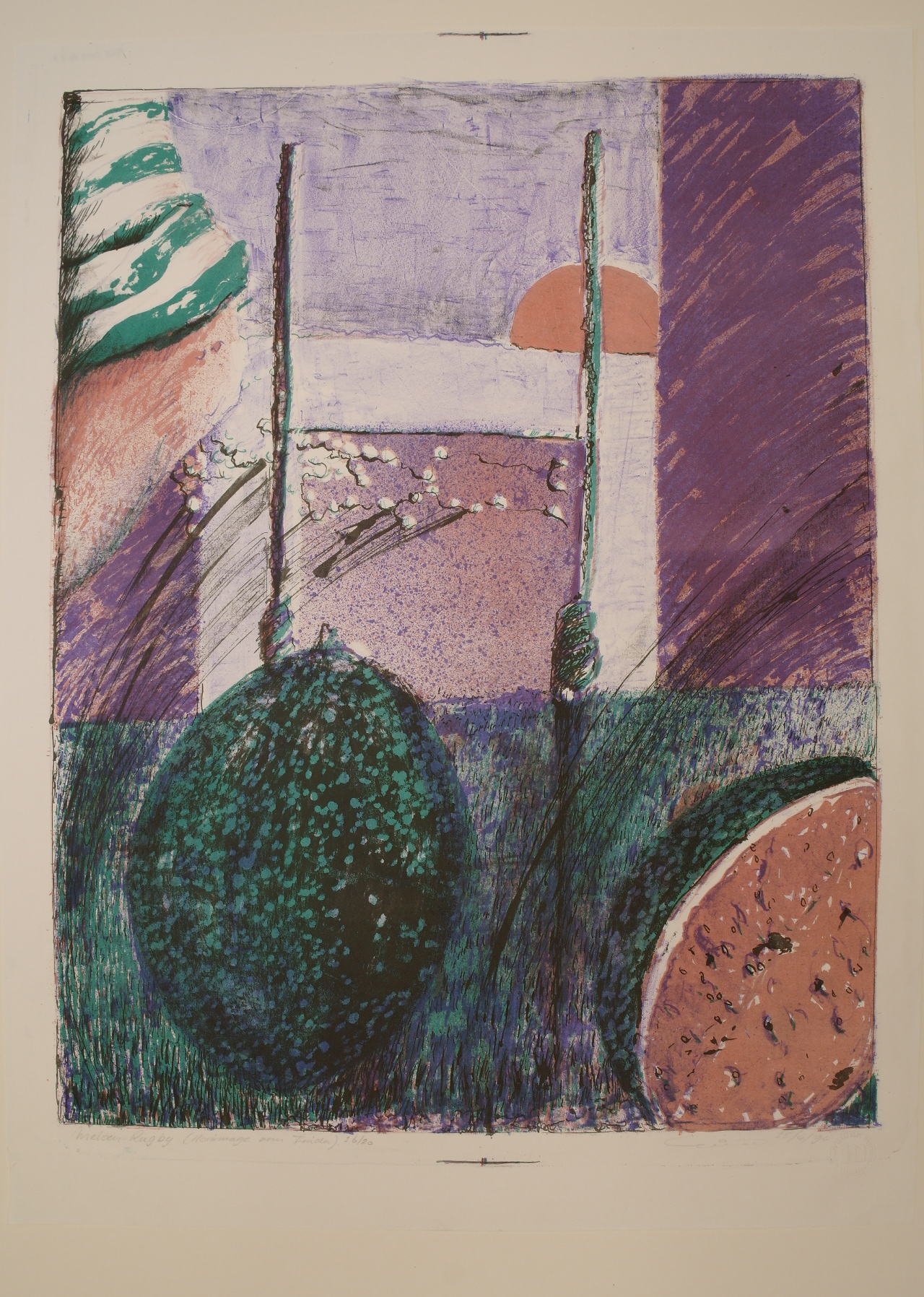 Meloen rugby (Hommage aan Frida) – 1994, kleurenlitho/papier (oplage 20), 690 x 540 mm, geannoteerd en genummerd in potlood l.o. onder plaat: Meloen-Rugby (hommage aan Frida) 16/20, gesigneerd en gedateerd in potlood r.o. onder plaat: Wied 15-4-’94