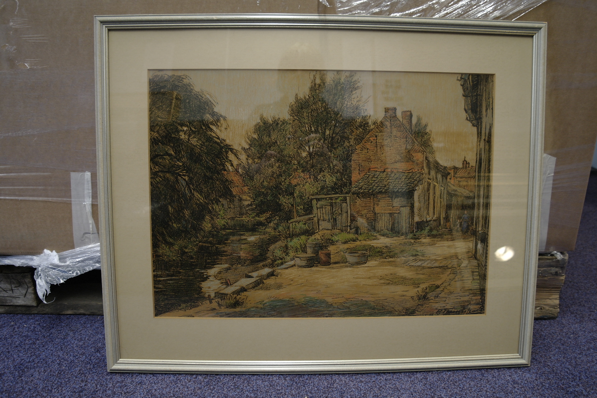 De Plekhoek met rechts Bakkerij Paulissen, zwart krijt en gekleurd pastelkrijt/papier, 395 mm x 550 mm, gesigneerd r.o.: P. Teunissen