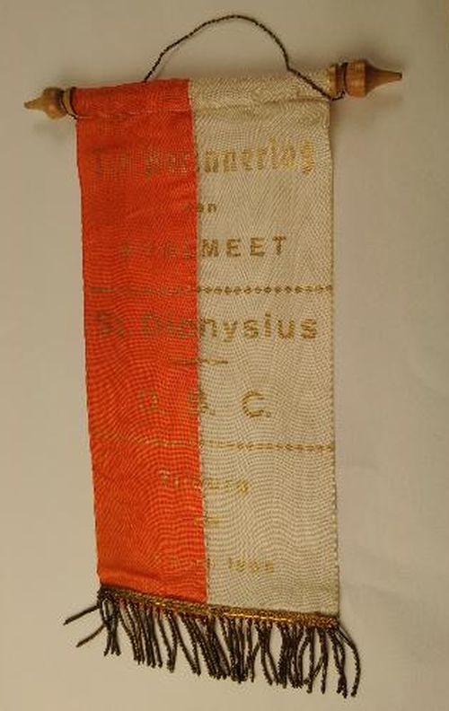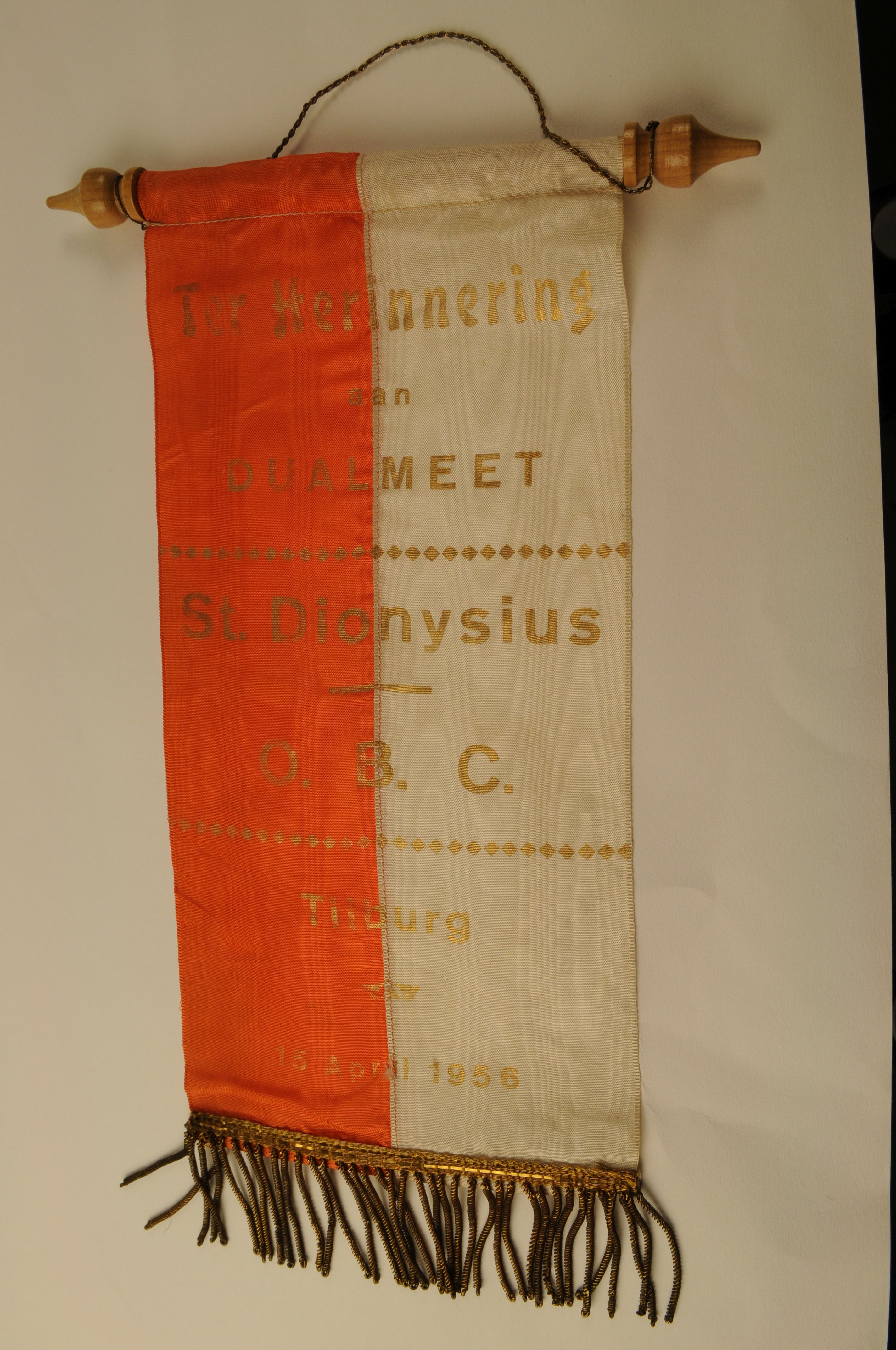 Vaantje Dual Meet St. Dionysius en OBC in Tilburg – 1956, materiaal: nylon, koord en hout, kleur: oranje/wit, afmetingen: 35 x 15 cm, afm. stokje 22,5 x 0,6 cm, bovenaan recht met ophangstokje en koordje, onderaan franjezoom van gouddraad, verticaal oranje – wit gebaand vaantje met in vergulde letters de opdruk: ‘Ter herinnering aan Dualmeet ...