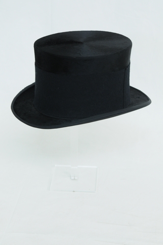 Hoge hoed, rouwhoed, materiaal: haarvelours, kleur: zwart, met zwart vilten band erom heen. lederen band binnenzijde met merktekens: 'The AvB Manufactory' ' The Adbar Hat' en 'Maison Moderne Tilburg' (verkoper)