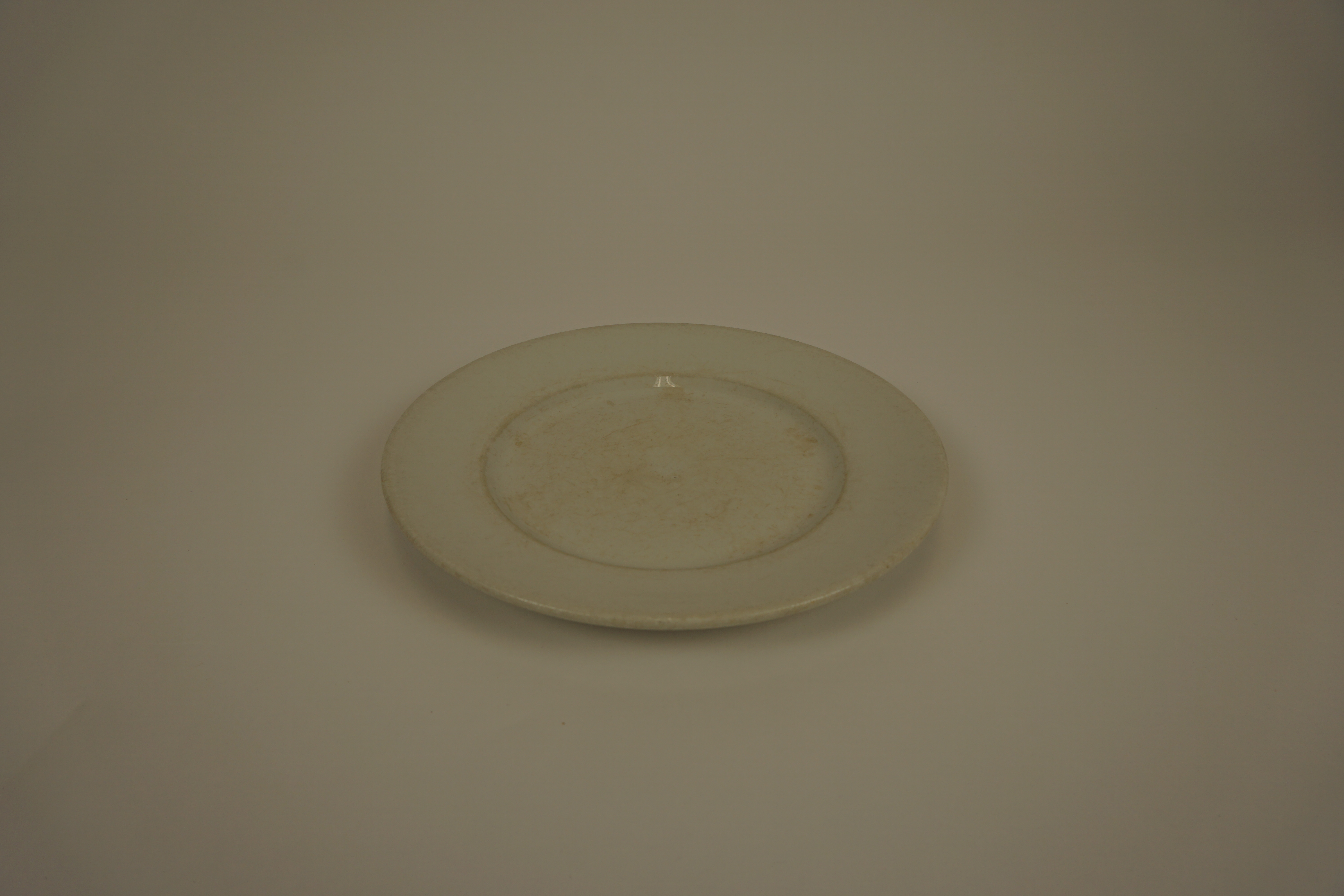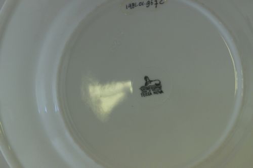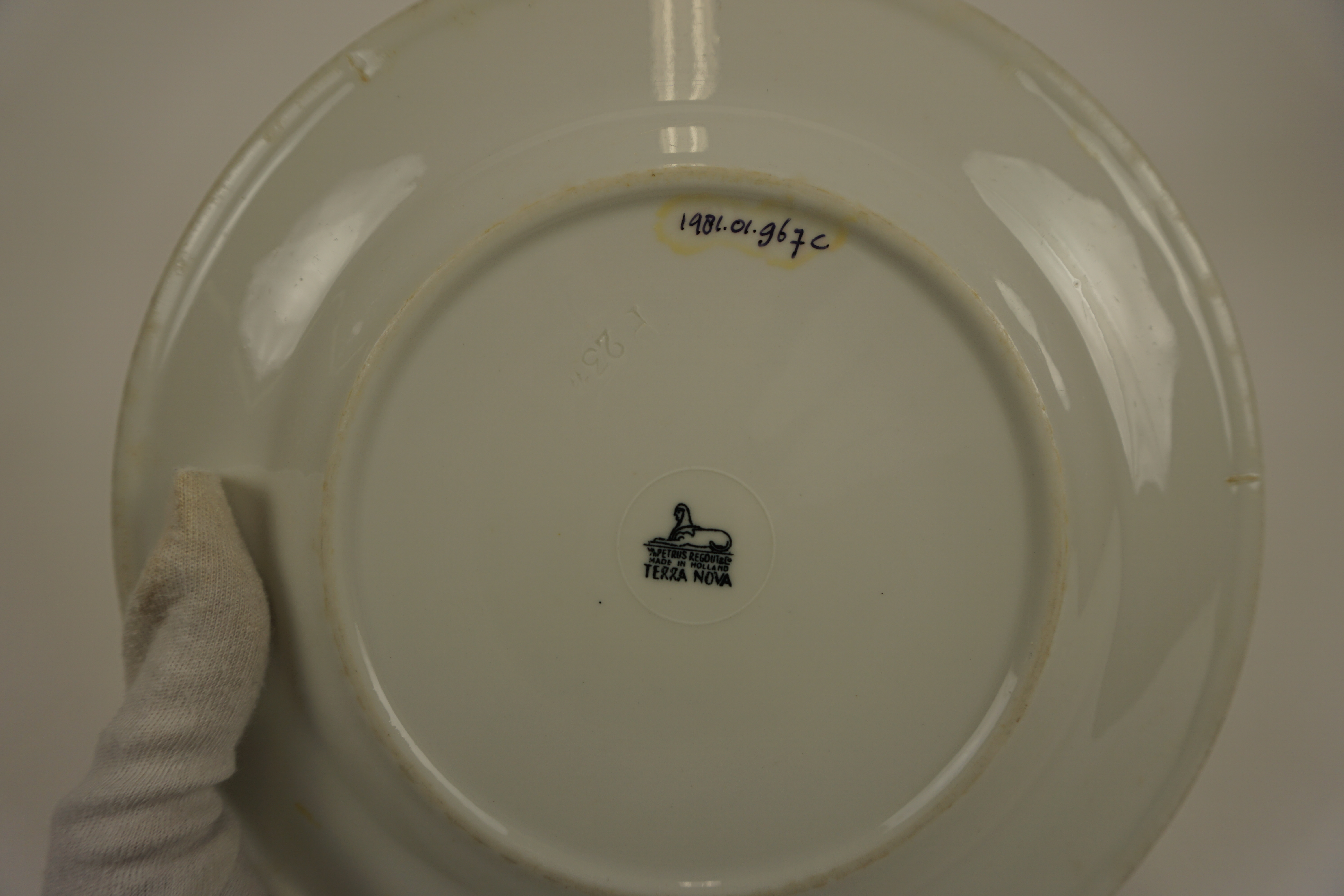 Plat bord - eerste helft van 20e eeuw, witbakkend geglazuurd aardewerk, afmetingen: 2,5 x 23,5 cm, op de onderzijde van de bodem gemerkt: 'v/h Petrus Regout en Co MADE IN HOLLAND (niet omkaderd) TERRA NOVA', blindstempel: 'P 23 1/2' gemerkt: v/h Petrus Regout en Co MADE IN HOLLAND (niet omkaderd) TERRA NOVA blindstempel: P 23 1/2
