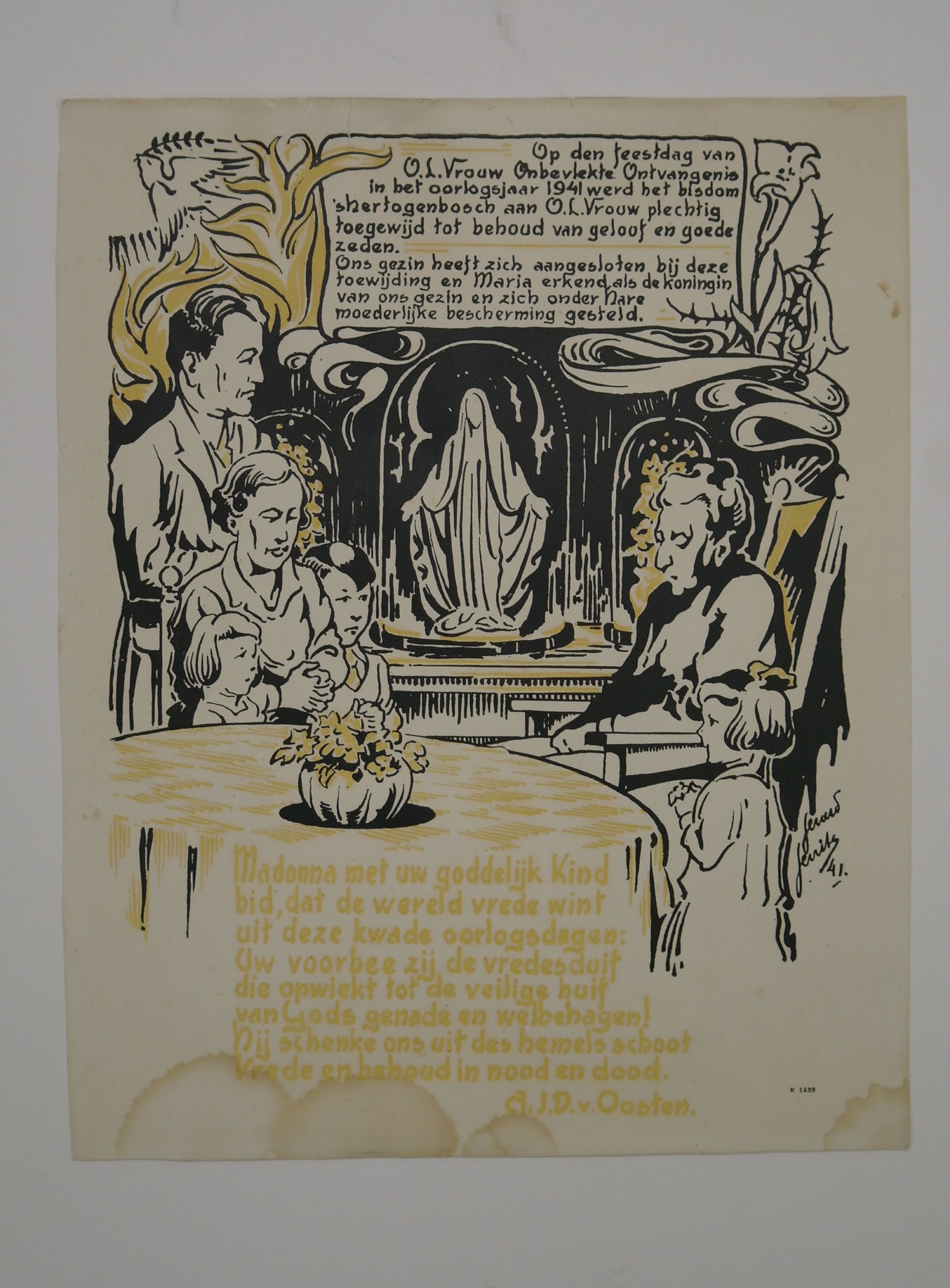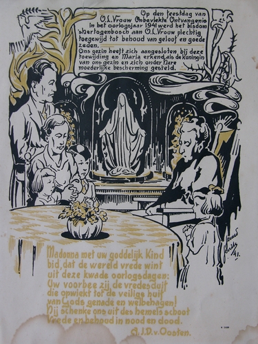 afbeelding: gezin voor lage kast met stolpmadonna. tekst: Boven heeft betrekking op toewijding bisdom 's-Hertogenbosch aan O.L.V. onder; gedicht van A.J.D. v Oosten