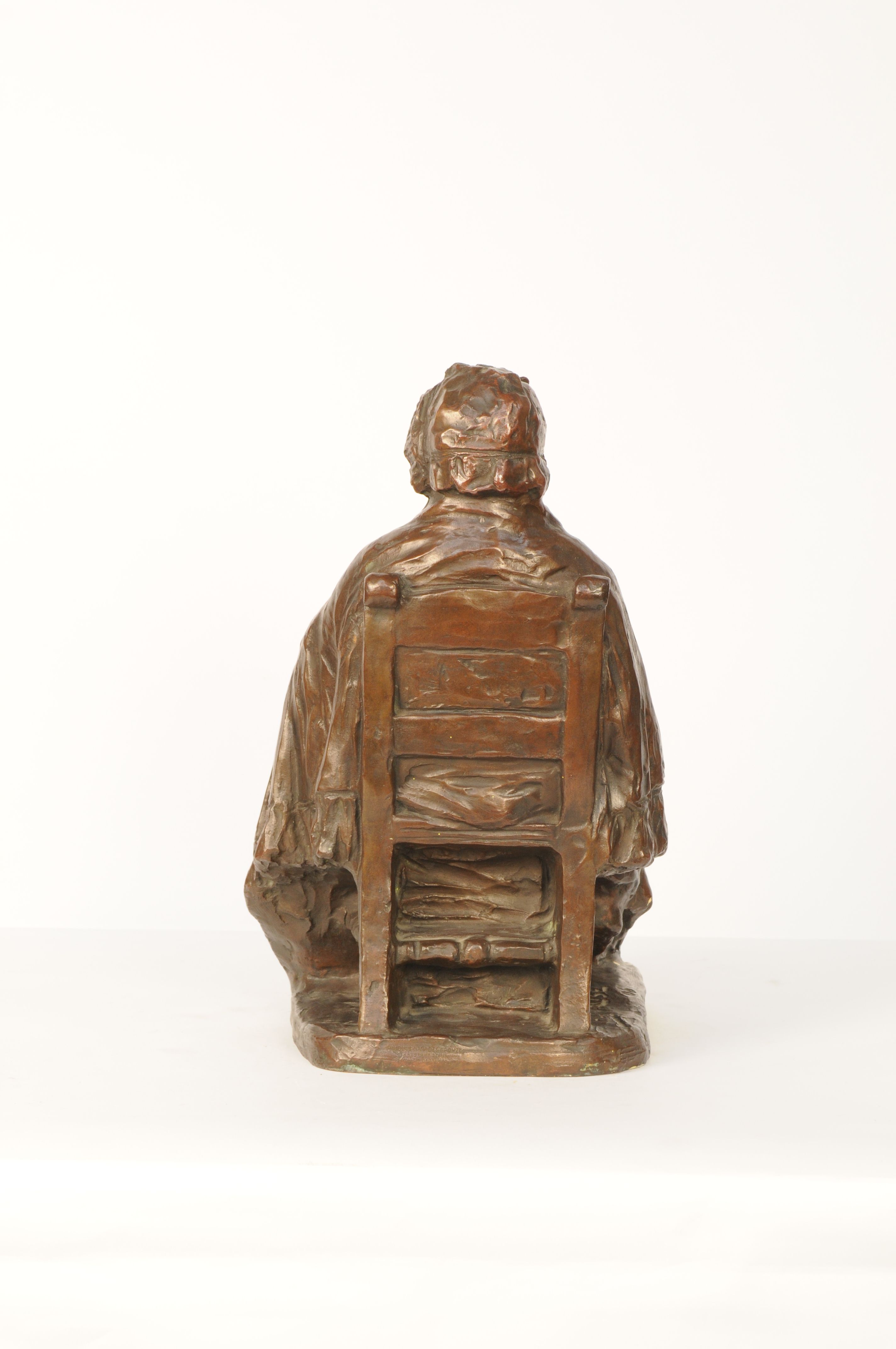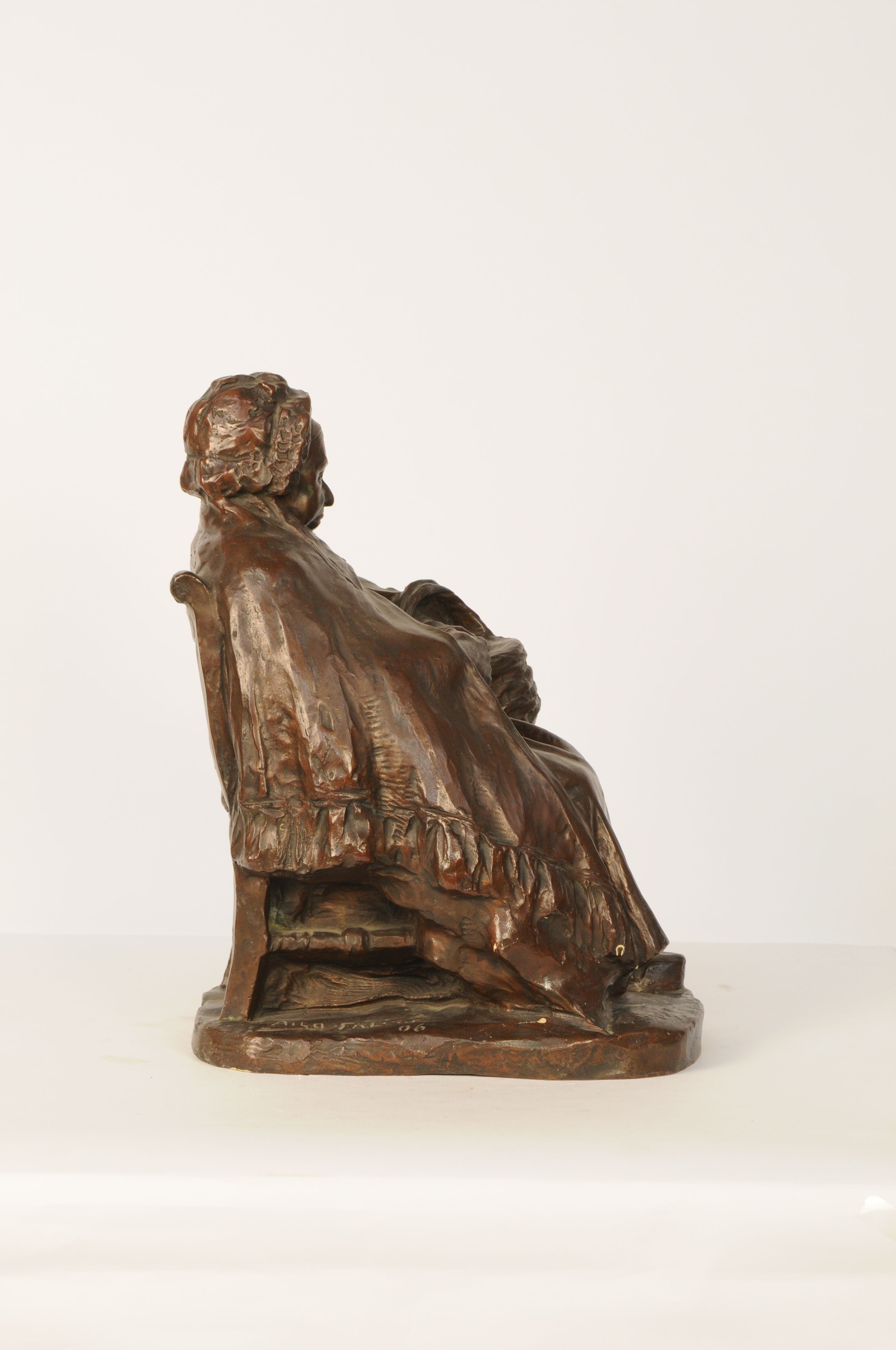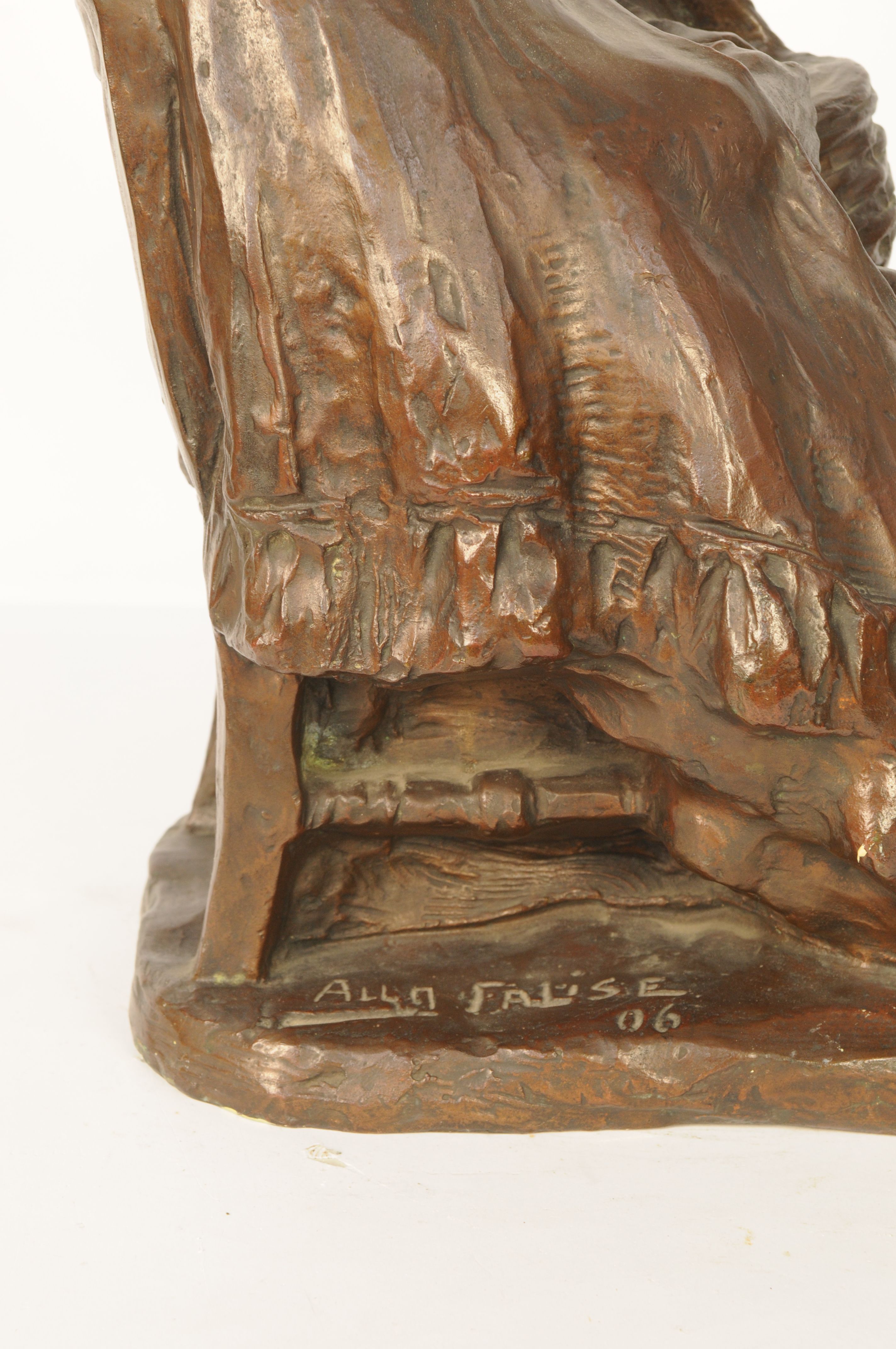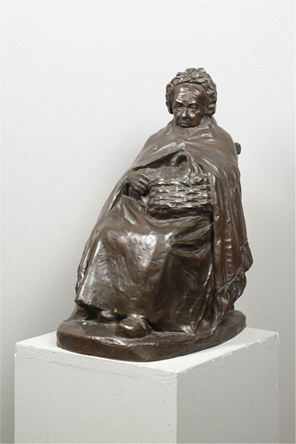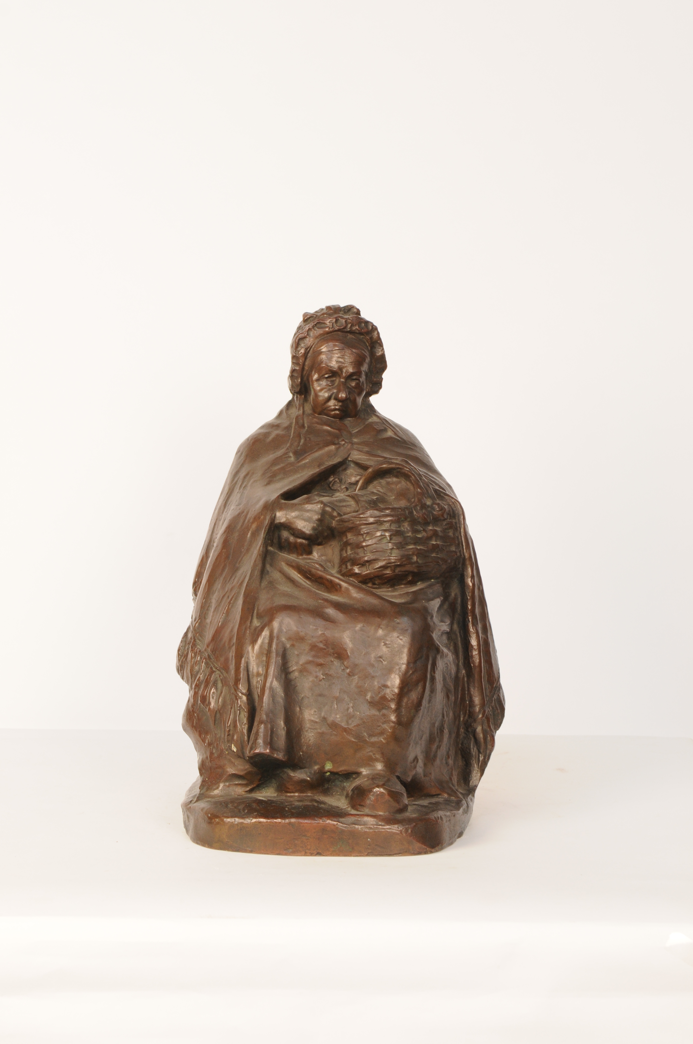 Rustend na de markt - 1906, brons, 42,5 x 27 x 34 cm, gesigneerd en gedateerd: AUG. FALISE 06, gegoten: FONDERIE NATLE DES BRONZES ANCNE FIRME J. PETERMANN ST. GILLES BRUXELLES Rustend na de markt. Beeld van een zittende oude vrouw met mand op haar schoot. - 1906, brons, 42,5 x 27 x 34 cm, gesigneerd ...