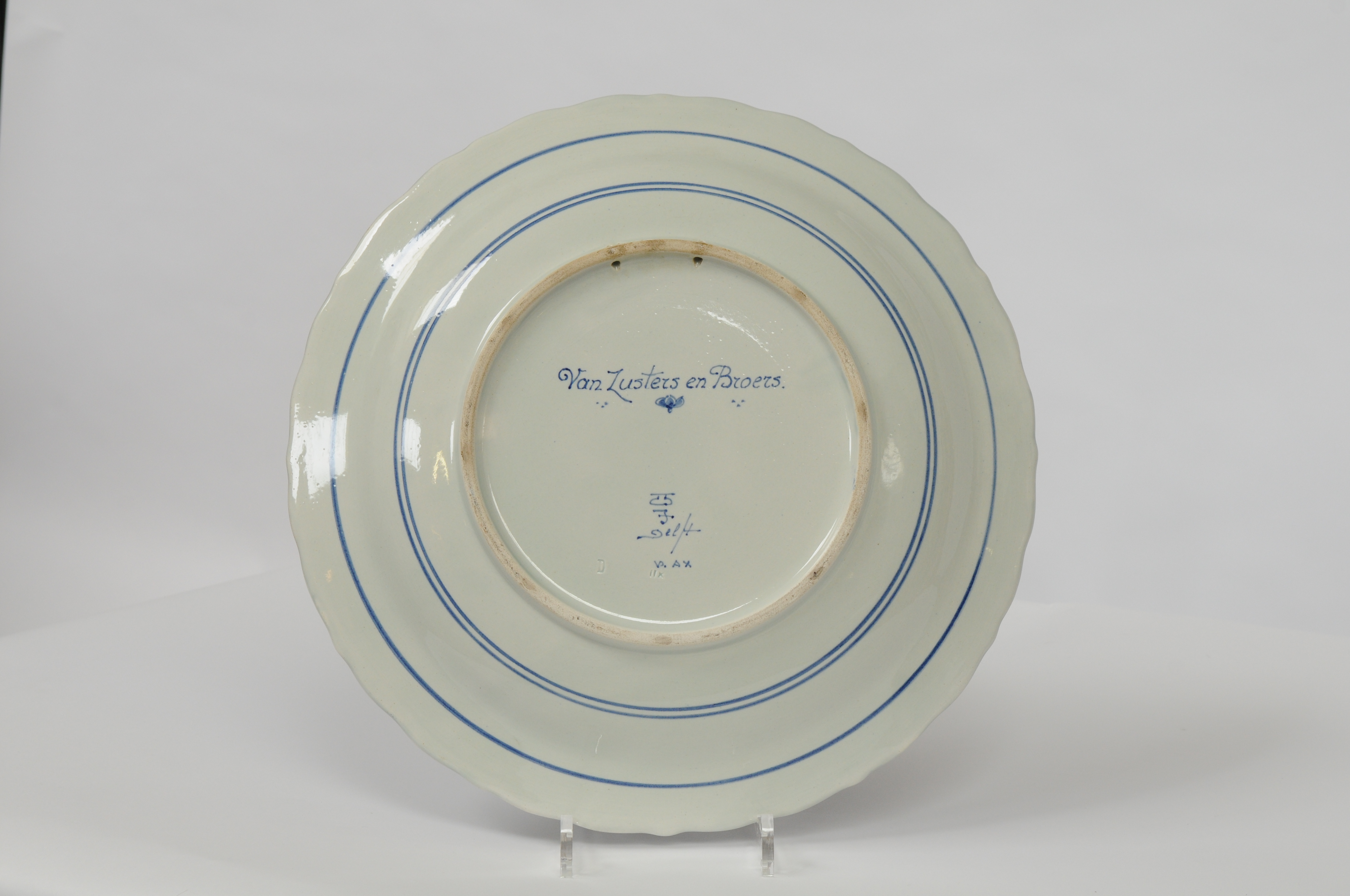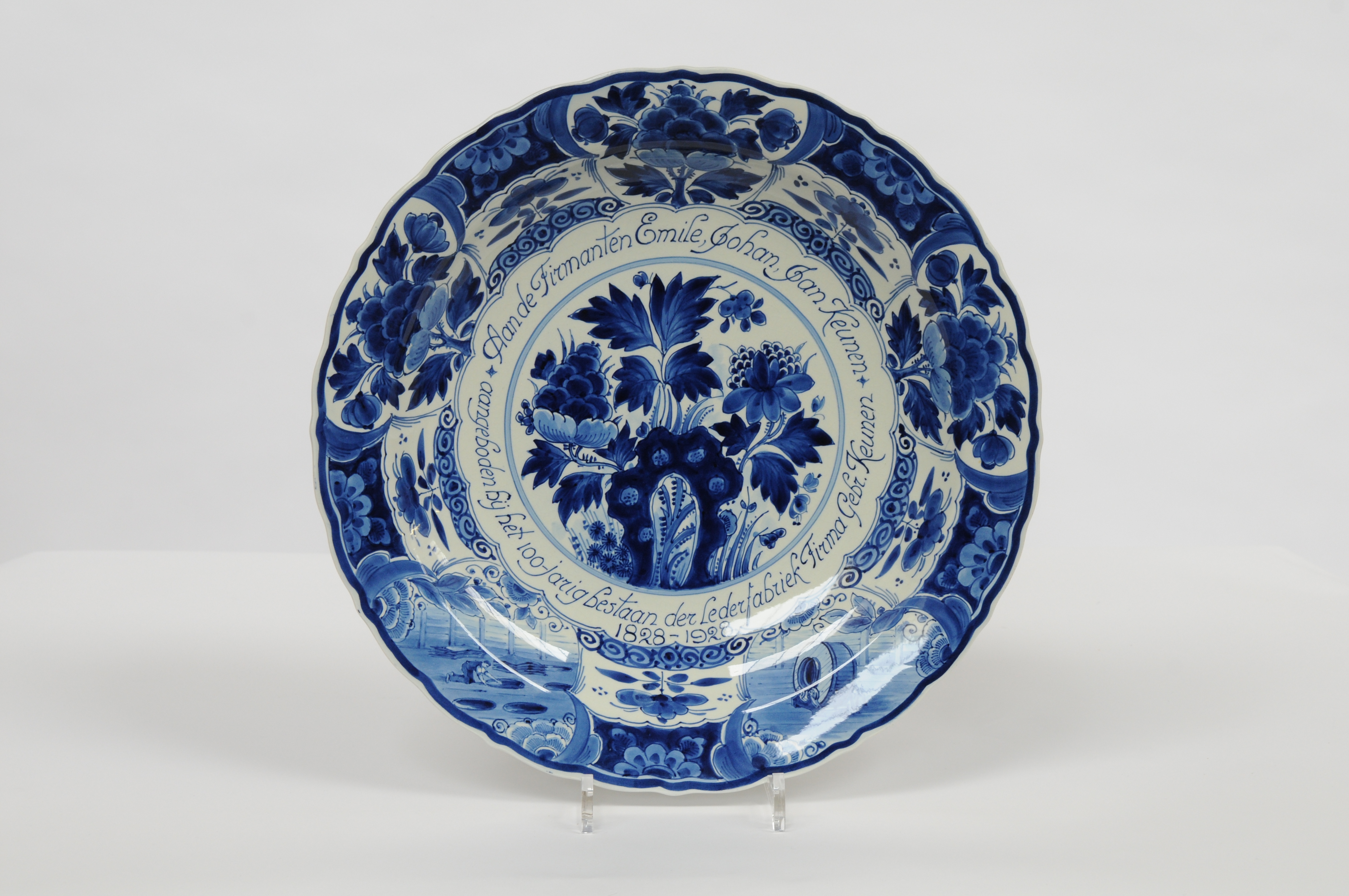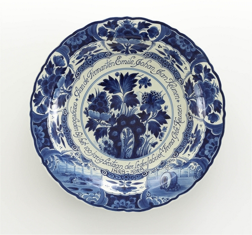 Herdenkingsbord, blauw-wit geglazuurd aardewerk met licht gelobde rand. Centraal: een bloemmotief, daaromheen: opschrift in circelvorm: 'Aan de Firmanten Emile, Johan en Jan Keunen aangeboden bij het 100-jarig bestaan der Lederfabriek Firma Gebr. Keunen 1828 - 1928'. Op de achterzijde (centraal) het opschrift: 'Van Zusters en Broers' + het merkteken: Delft. Vervaardiging: De Porceleyne Fles. de ...