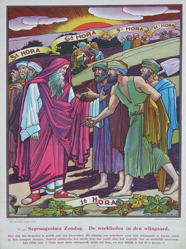 Schoolplaat:No. 31 Septuagesima Zondag, de werklieden in de wijngaard. Gesigneerd, gemonogrammeerd (met monogramteken) en gedateerd in voorstelling r.o.: Jos. Speybrouck 23, onder voorstelling r.o.: Chromolith. J.L. Goffart SA Bruxelles Uit de reeks 'Liturgisch apostolaat'