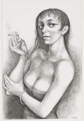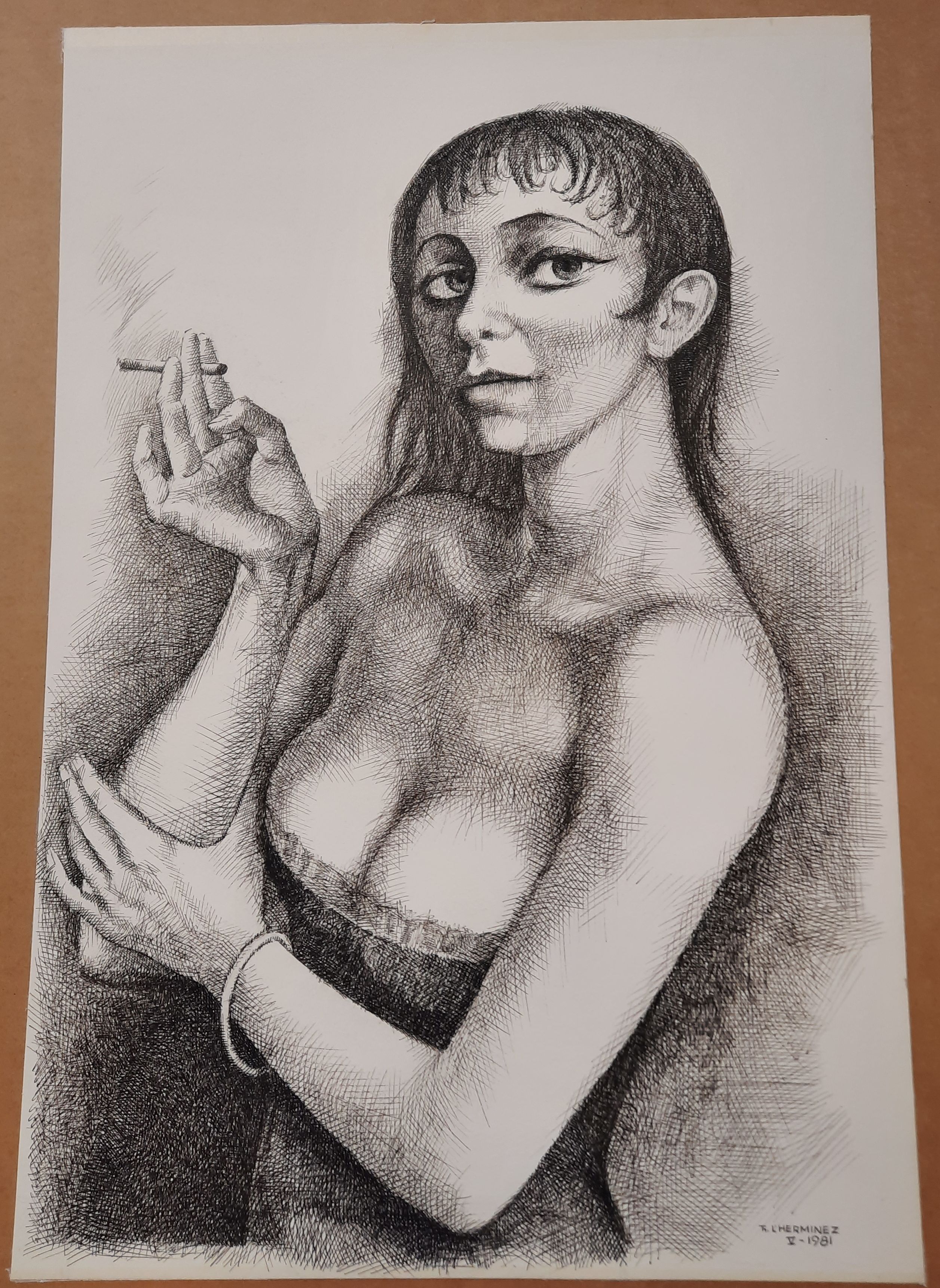 Vrouw met sigaret - 1981, Oostindische inkt/papier, 450 x 300 mm, gesigneerd en gedateerd r.o.: Th. l'HERMINEZ V - 1981