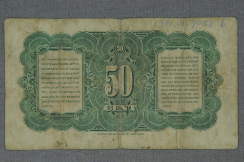 Muntbiljet van een halve Nederlandsch-Indische Gouvernementsgulden (lima poeloeh sen) = 50 cents - 1943/1947, materiaal: kleurenlithografie/papier, afmetingen: 72 x 125 mm