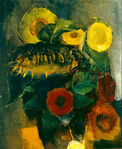 Zonnebloemen - z.j., olieverf/doek, 73 x 60 cm, gesigneerd r.o.: HJ Pessers