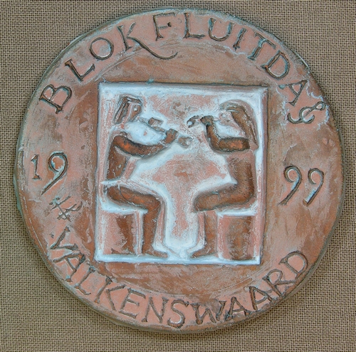 Penning Blokfluitdag Valkenswaard 1999 - 1999, keramiek/beschilderd, diam. 74 mm, dikte 10 mm, opschrift: 'BLOKFLUITDA (g-sleutel) VALKENSWAARD 1999', gemonogrammeerd: 'H + f-sleutel'