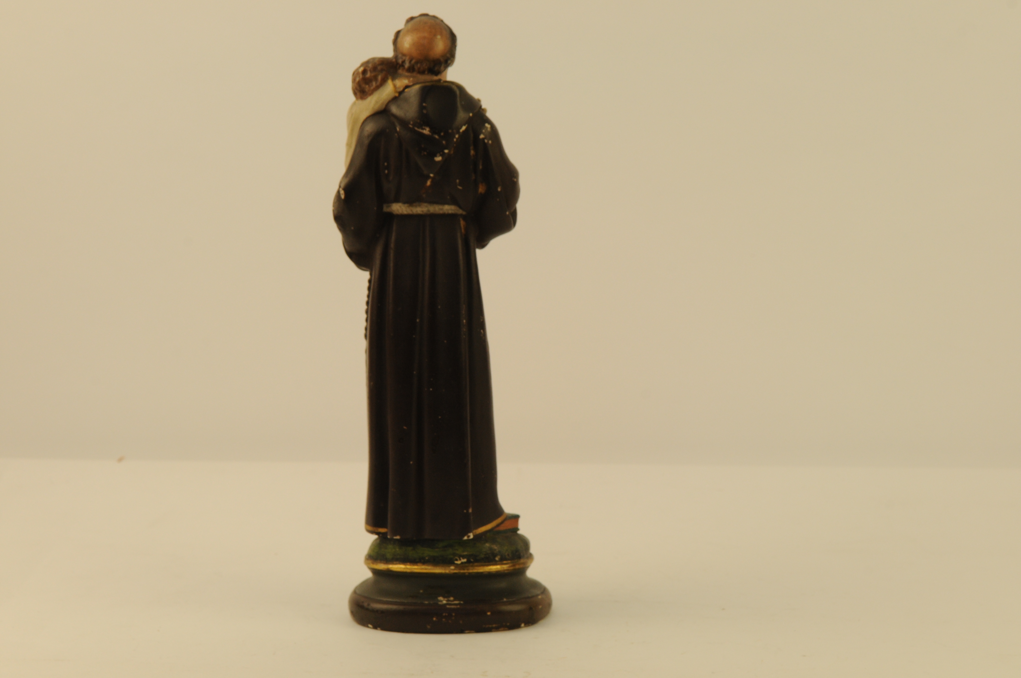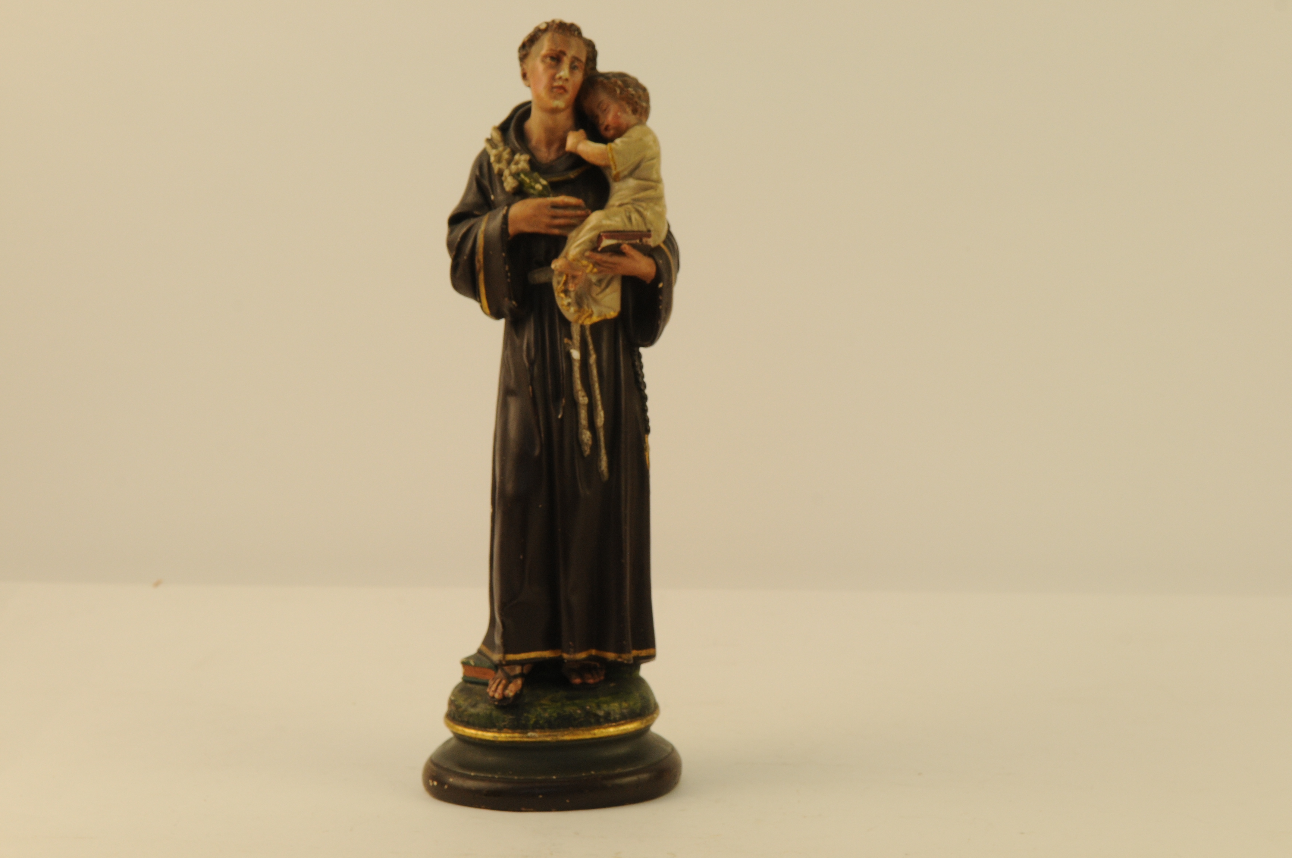 Gepolychromeerd gipsen beeld, voorstellend de heilige Antonius van Padua. Staande met in linkerhand een bijbel waarop Jezus als kind en in de rechterhand een bos lelies. Op ovalen voetstuk.