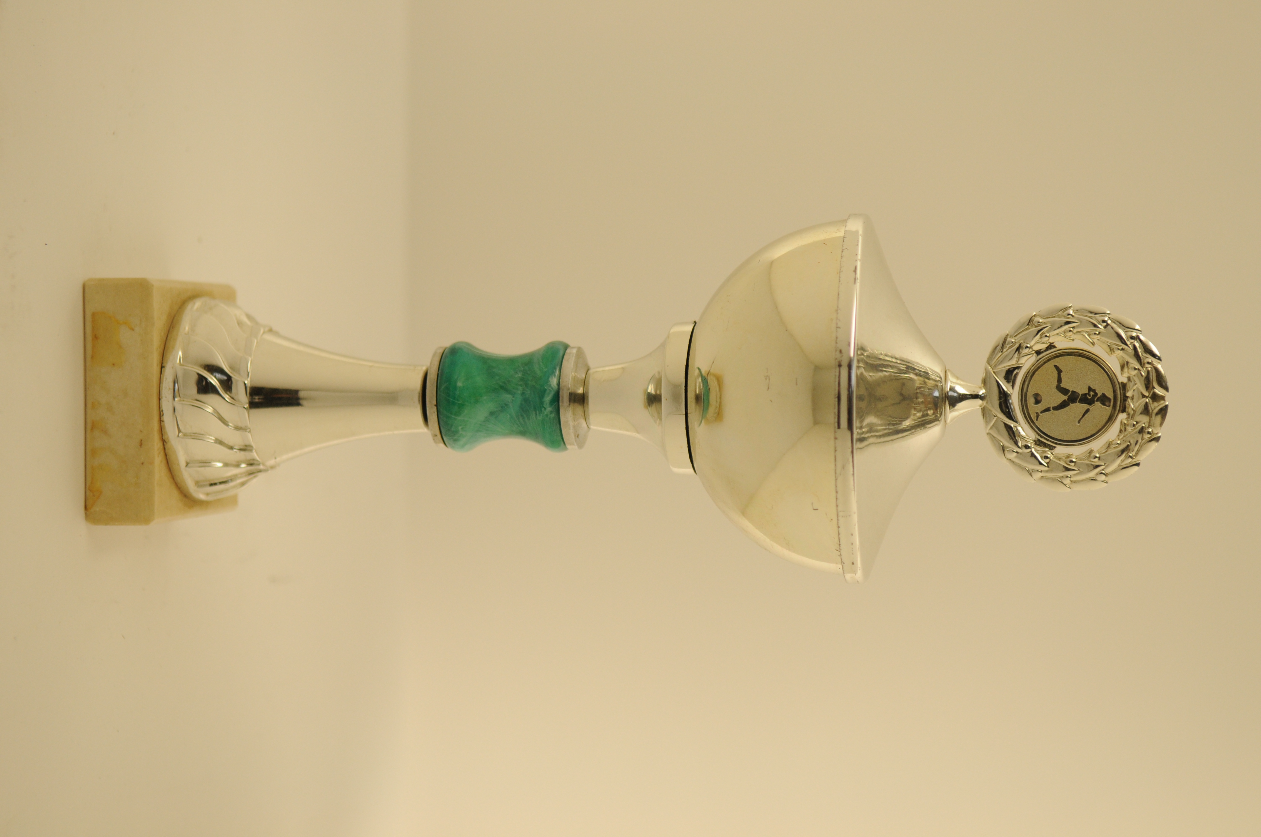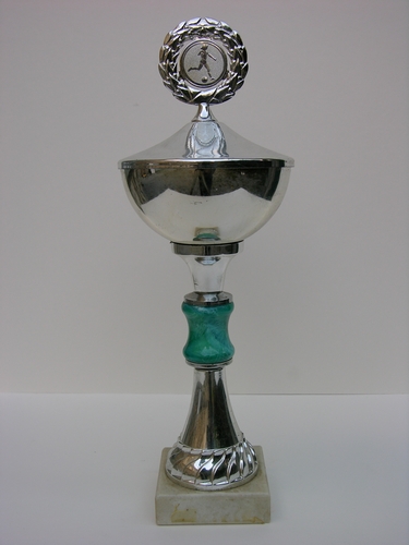 Prijsbeker voetbalvereniging RKSV, met deksel, bekroond door medaillon met een voetballende dame omringd door een lauwerkrans. Voetstuk marmersteen (kunststeen). Sticker met “Bekerhuis Osmi Sportprijzen Wiek 11 Ulvenhout”. Opm: tekstschildje voorzijde is verwijderd Prijsbeker voetbalvereniging RKSV, met deksel, bekroond door medaillon met een voetballende dame omringd door een lauwerkrans. Voetstuk marmersteen (kunststeen). Sticker met “Bekerhuis Osmi Sportprijzen ...