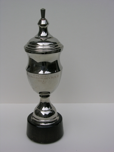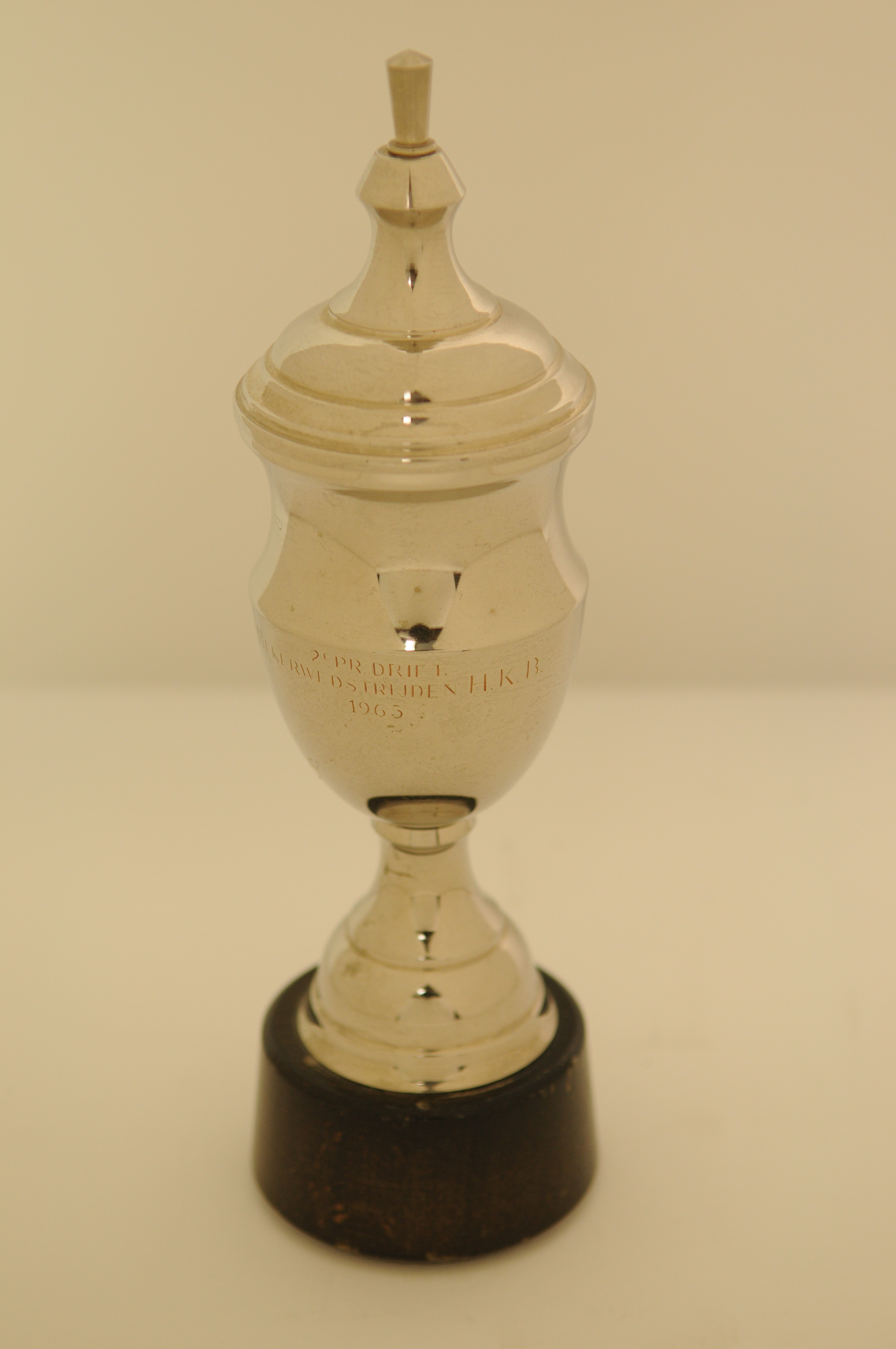 Prijsbeker Kegelclub 'Vol moed' Eindhoven, prijsbeker met losse deksel, metaal/hout, inschrift: 2e pr. driet. bekerwedstrijden H.K.B. 1965