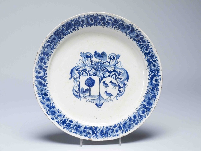 Wapenbord waarop twee wapens omgeven door accantusbladeren, boven de twee wapens een helm met daarop een haan