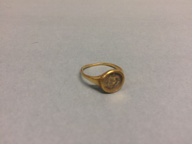 Gouden ring met wapenbord, initialen en datering achter glas., achter glas een geëmailleerde voorstelling: PM 15 66 + wapenbord