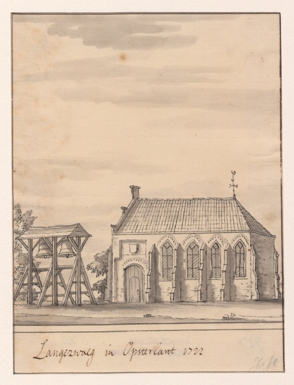 Gezicht op de kerk met klokstelling te Langezwaag in Opsterland
