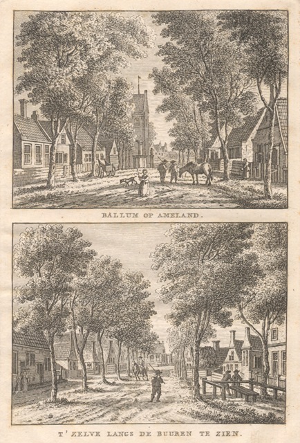 Gezicht op de toren en de gerechtsplaats en langs de Buuren te Ballum op Ameland