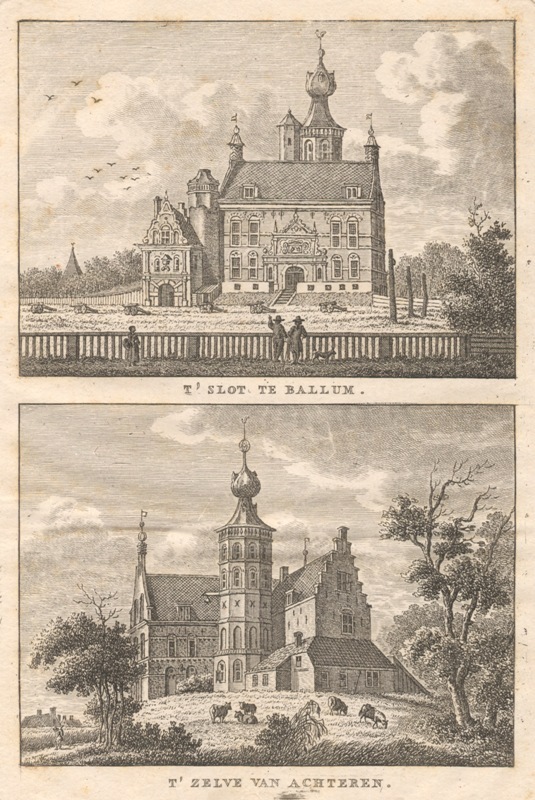 Gezicht op de voor- en achterzijde van het Slot Camminga te Ballum op Ameland