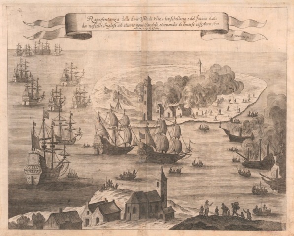 Gezicht op de eilanden Vlieland en Terschelling bij de beschieting van de Engelsen