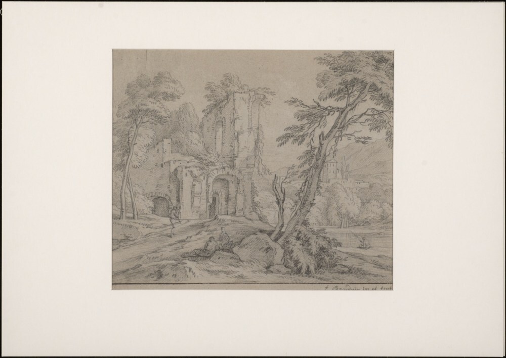 Italiaans landschap met ruïne, op de achtergrond bergen