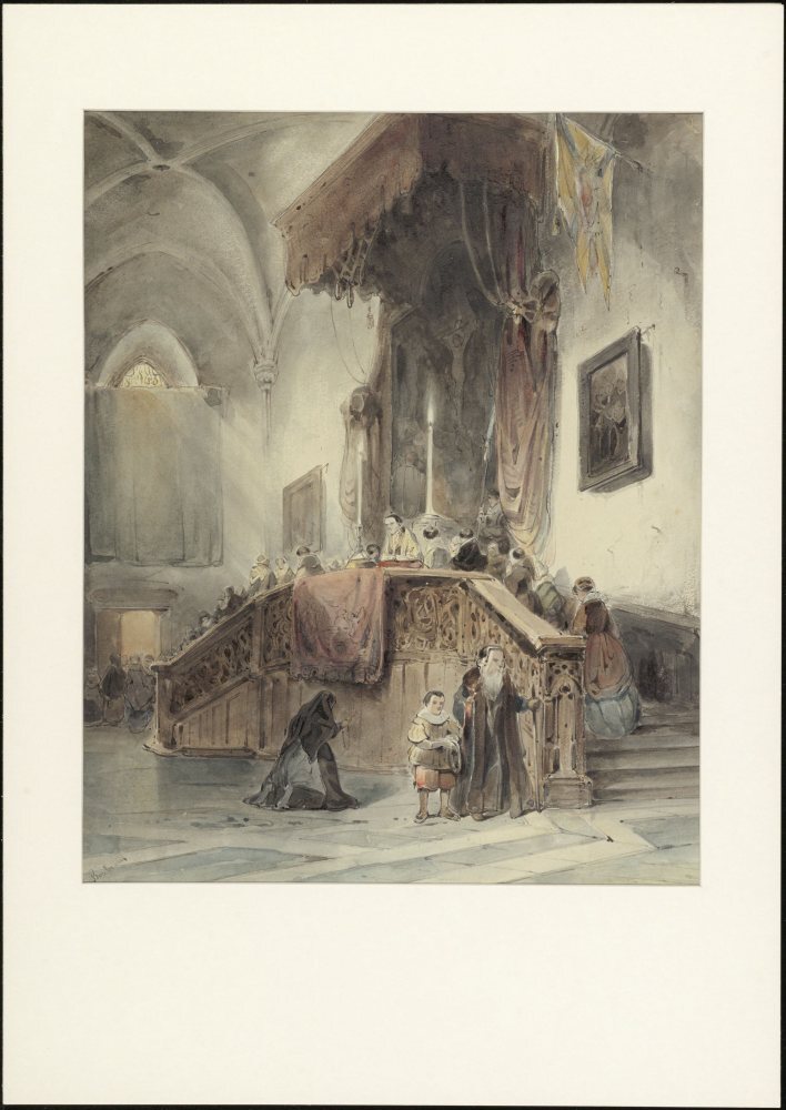 Kerkinterieur met altaar waarop priester