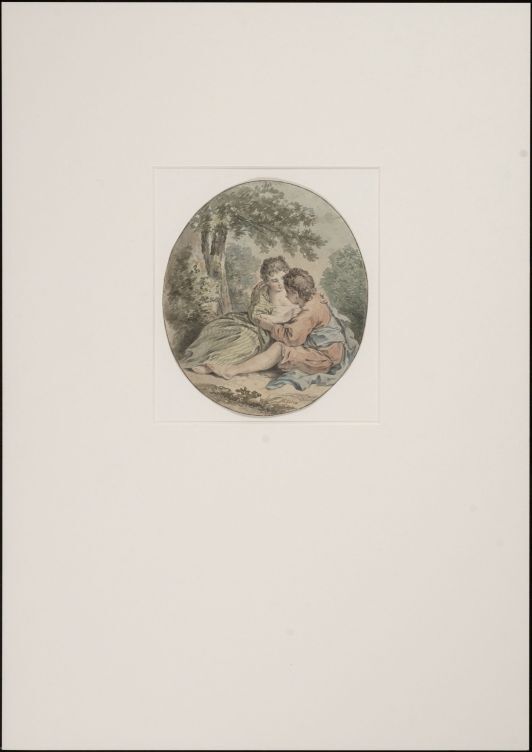 Pastorale, in een landschap bij een boom en struiken zitten een herder en een herderinntje te minnekoozen