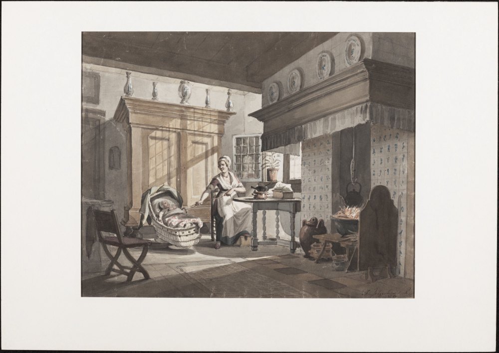 Interieur met vrouw die baby wiegt