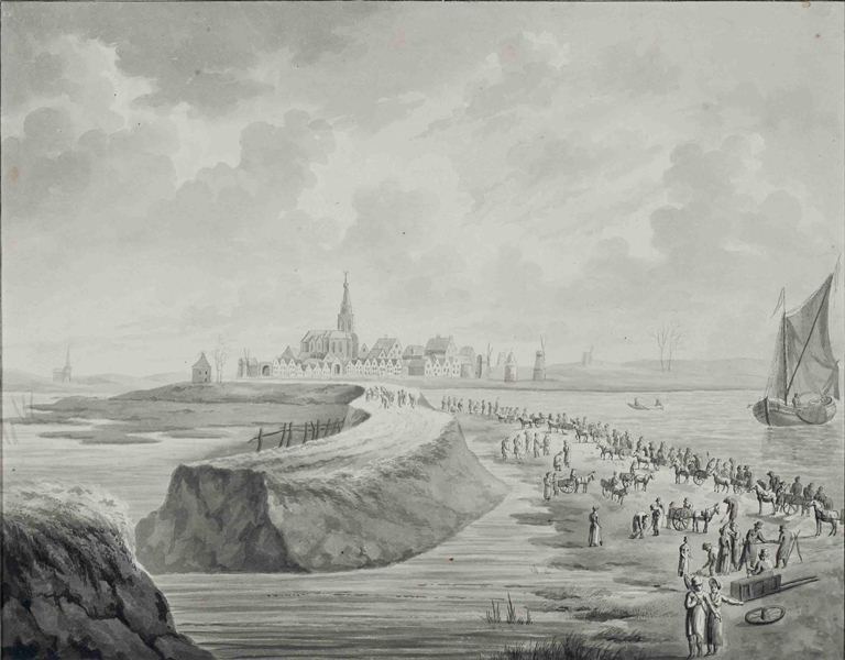 Gesigt van de dijk Oosterhout bij Nijmegen en het stoppen van die doorbraak door 700 a 800 man