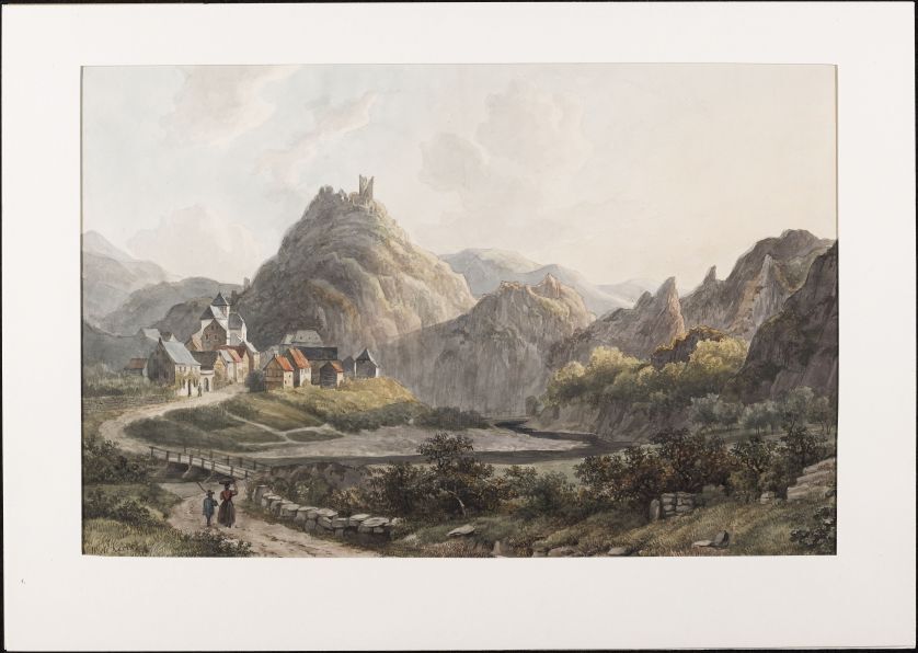 Berglandschap met riviertje en rüine